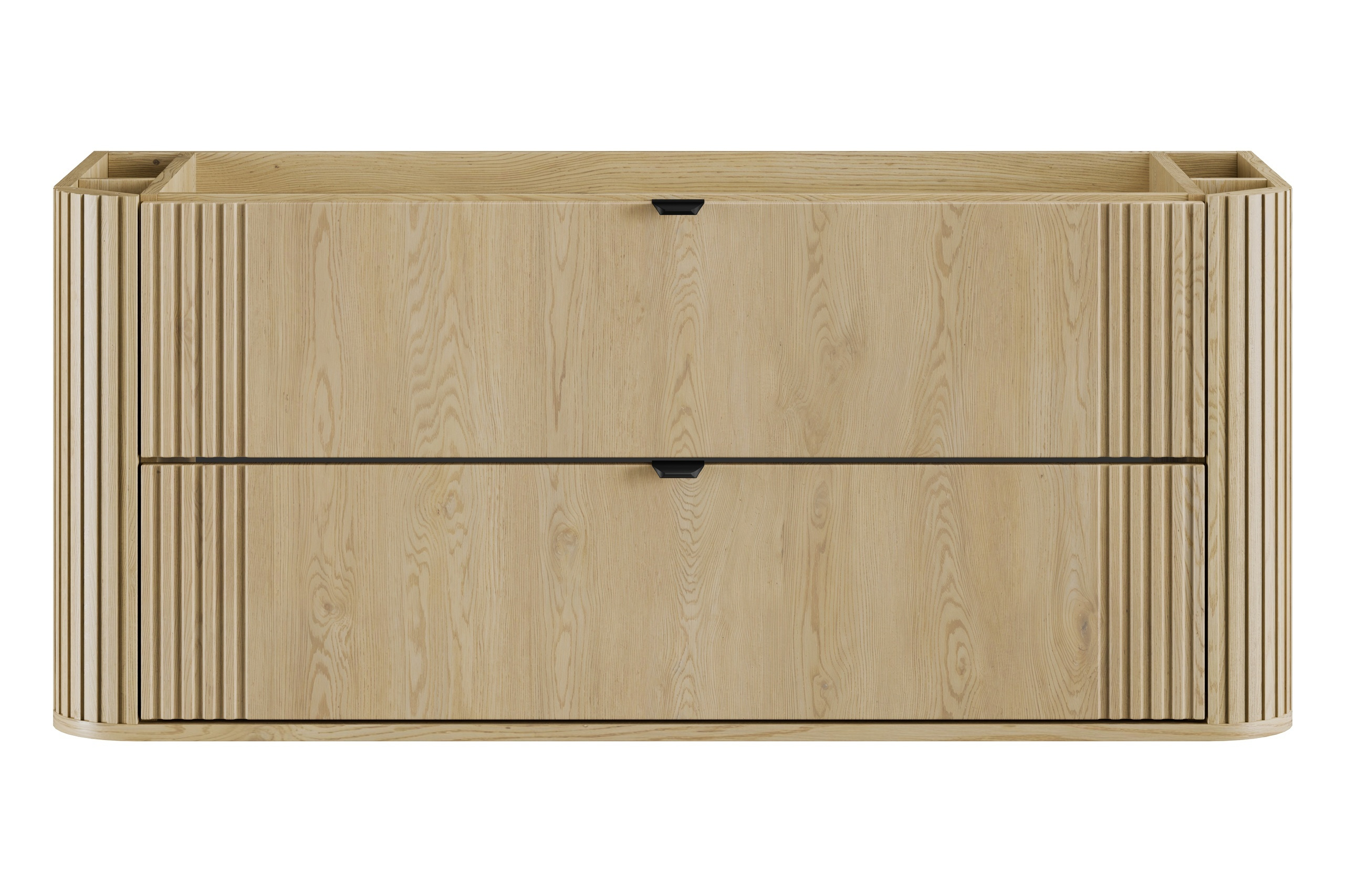 Charakterystyczne zaokrąglone rogi nadają bryle wizualnej lekkości, a efektowne pionowe ryflowania zdobiące zarówno fronty, jak i boki mebla, podkreślają jego wyrazisty, a jednocześnie harmonijny charakter. Ciepły dekor Dąb Cremona doskonale odwzorowuje strukturę naturalnego drewna, tworząc przytulną i elegancką atmosferę we wnętrzu.