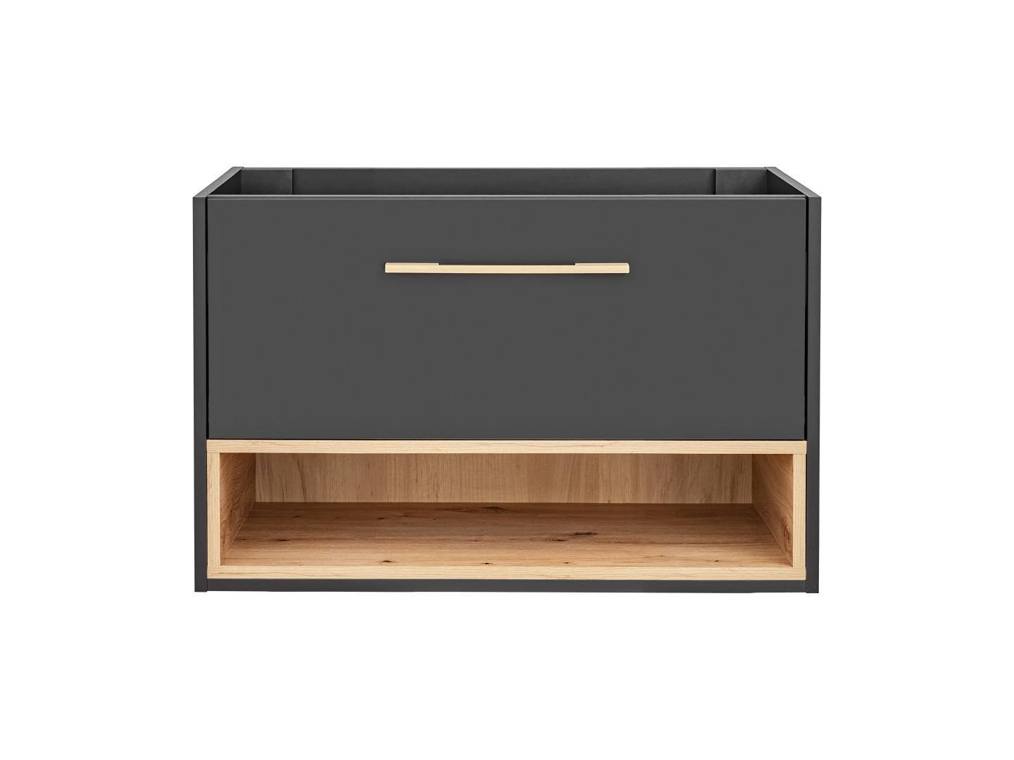 - Szafka pod umywalkę o szerokości 80 cm z jedną funkcjonalną szufladą i wnęką do przechowywania.