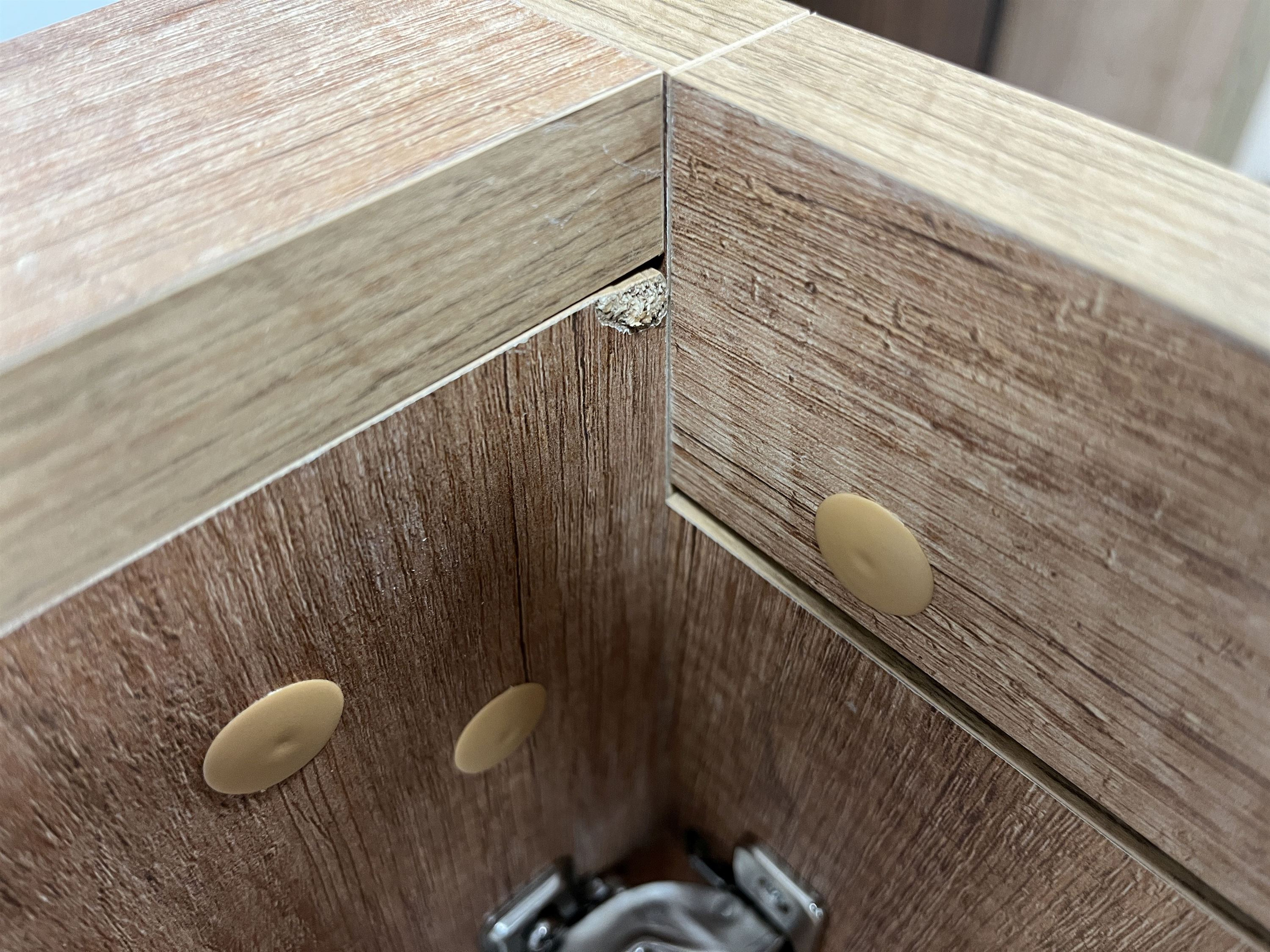 - Małe uszkodzenie na górnym wewnętrznym rogu szafki widoczne na zdjęciu. Stojąca szafka pod umywalkę została wykończona dekorem dębu country i uzupełniona o zawiasy z cichym zamykaniem, w środku szafki dodatkowa półka.