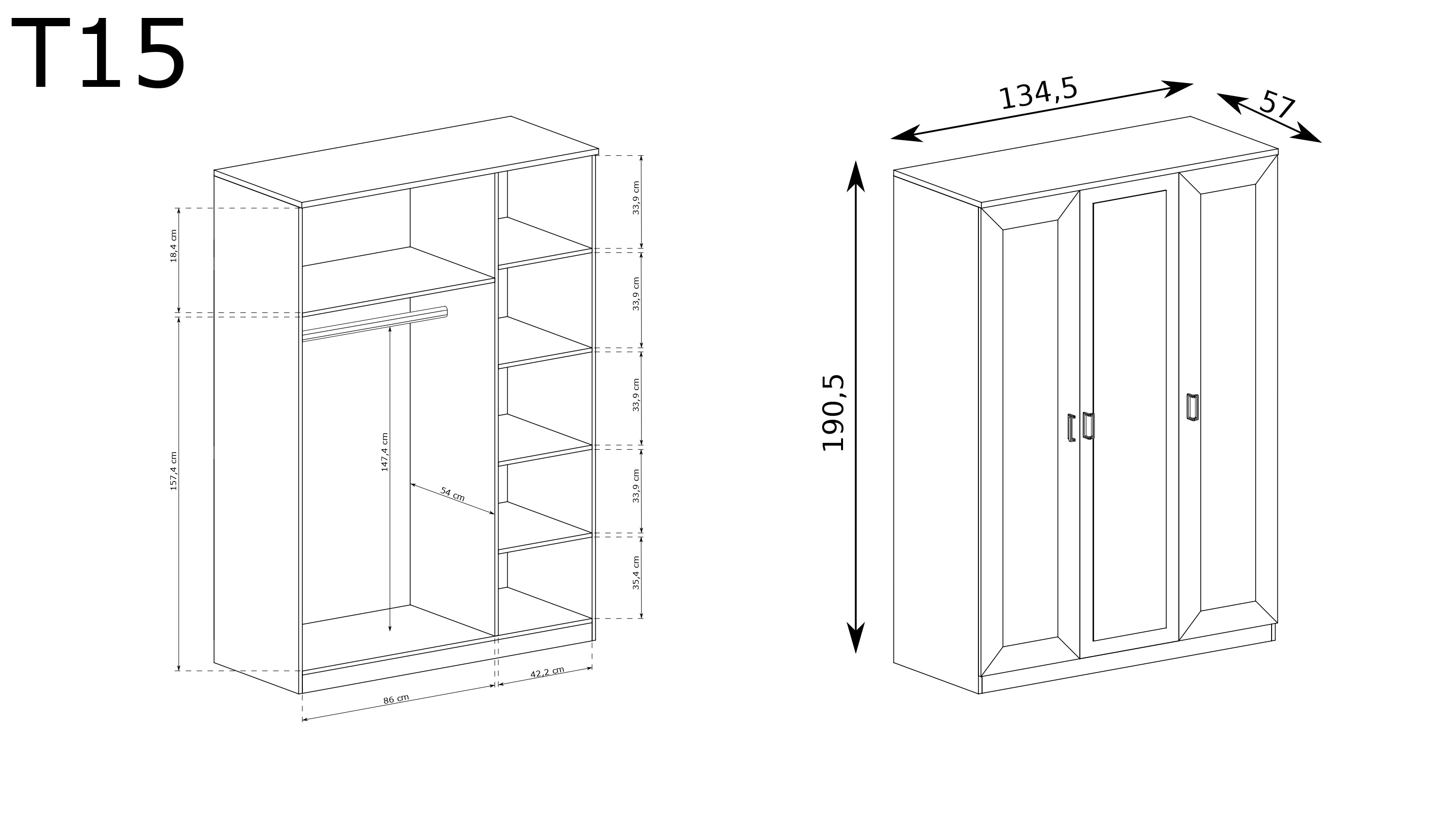 Szafa TADEUSZ-15 nie tylko zachwyca swoimi walorami estetycznymi, ale także jakością materiałów, z których została wykonana. Płyta laminowana zapewnia trwałość i łatwość w utrzymaniu czystości, a eleganckie złote uchwyty dodają całości subtelnego blasku. Zawiasy metalowe gwarantują długotrwałą i bezproblemową eksploatację, co sprawia, że szafa stanie się jednym z ulubionych elementów wyposażenia Twojego wnętrza.