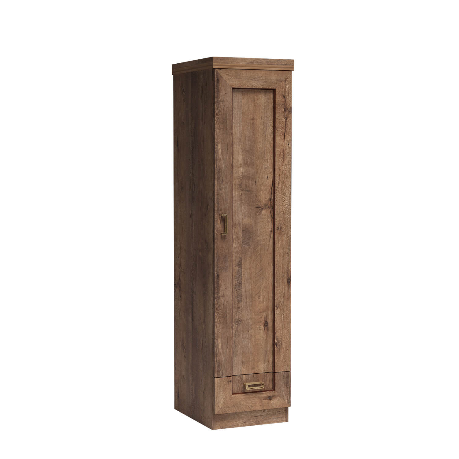 Szafa TADEUSZ-9 w kolorze Dąb Lefkas to idealne rozwiązanie do małych pomieszczeń. Mimo wąskich wymiarów, oferuje dużą pojemność, drążek oraz praktyczną szufladę. Metalowe uchwyty i zawiasy dodają elegancji.