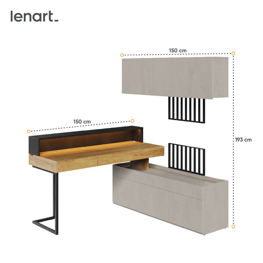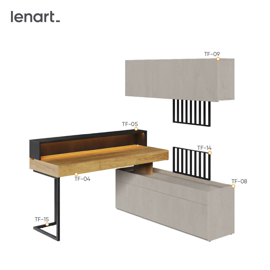 Zestaw TEEN FLEX SET-03 składa się z biurka TF-04, praktycznej nadstawki TF-05, szafki wiszącej TF-09, dwóch paneli TV TF-14 oraz pojemnej szafki TF-08. Wymiary całego zestawu – szerokość: 150 cm, wysokość: 193 cm oraz głębokość: 150 cm – są idealnie dopasowane do potrzeb młodych użytkowników. Mieszcząca 111,5 kg konstrukcja wymaga montażu, jednak dołączona instrukcja ułatwi stawianie pierwszych kroków w świecie DIY.
