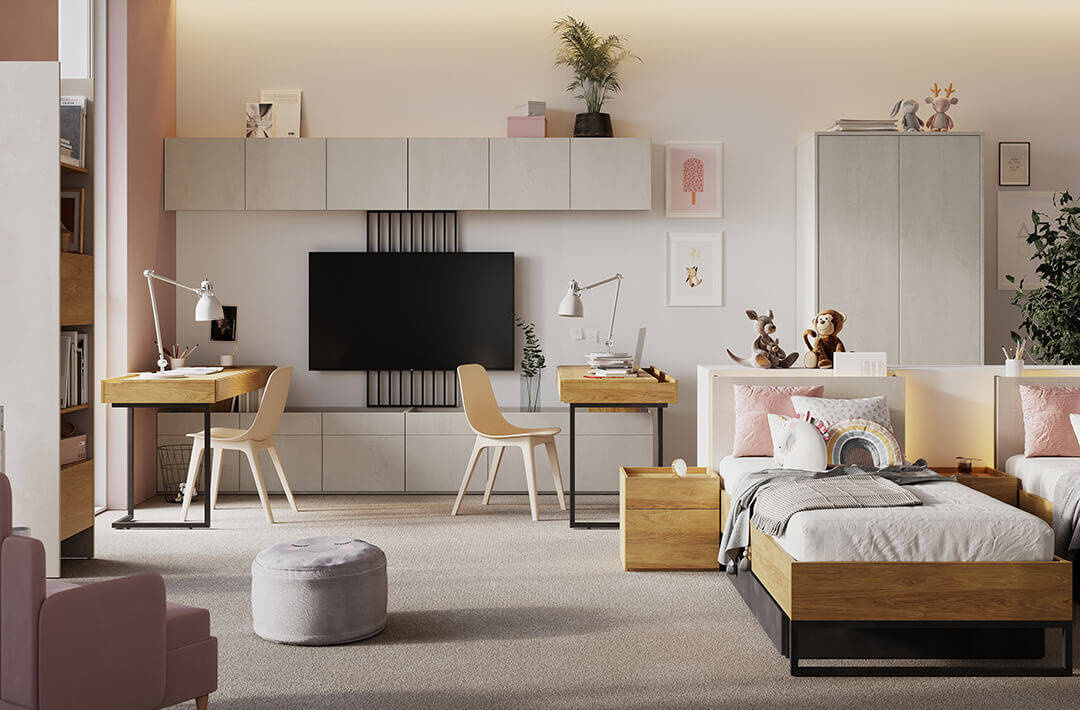 TEEN FLEX to kolekcja, która łączy w sobie nowoczesny design z ekspresją detali, jak metalowe nogi czy ślizgi z gwózdkami, co nie tylko dodaje elegancji, ale także zapewnia stabilność i trwałość mebli. Szafa w sypialni młodzieżowej stała się nie tylko elementem przechowywania, ale także wyrazistym fragmentem aranżacji, wpisującym się w najnowsze trendy wnętrzarskie.
