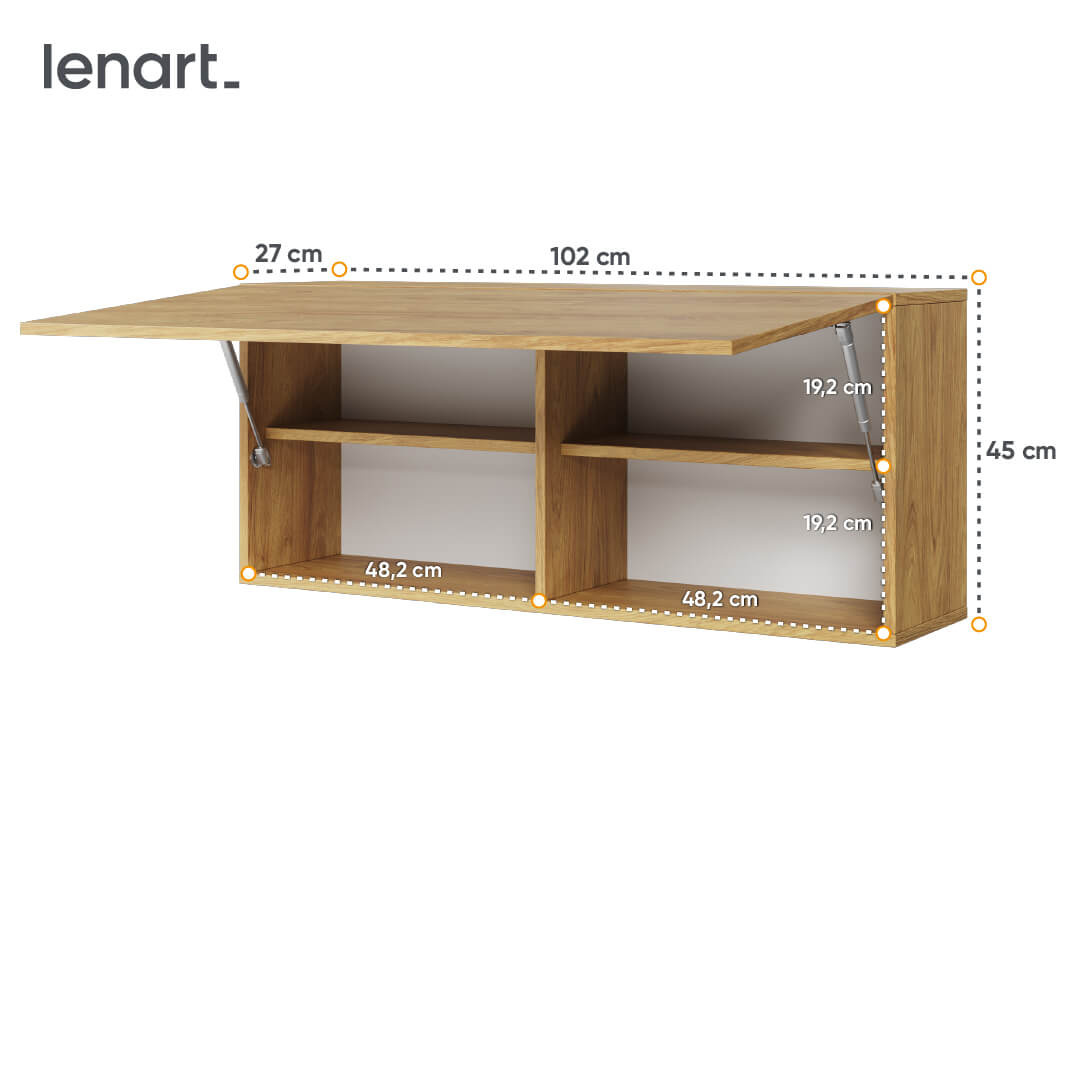 Dzięki szerokości 102 cm, wysokości 45 cm oraz głębokości 27 cm, szafka pozwala na efektywne zarządzanie przestrzenią. Bezuchwytowe fronty podkreślają minimalistyczny styl, zapewniając jednocześnie łatwość użytkowania. Otwieranie drzwi ułatwiono dzięki zastosowaniu zawiasów puszkowych, które charakteryzują się cichym i płynnym działaniem.