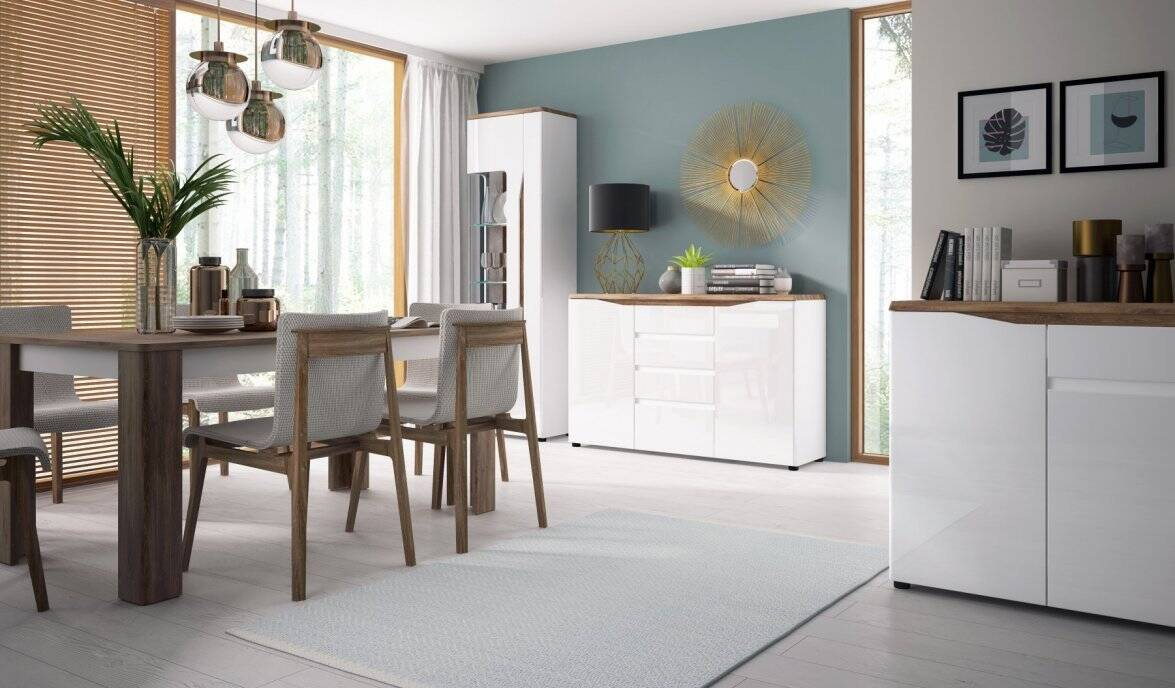 Jeśli jesteś miłośnikiem jasnych i przestrzennych wnętrz, kolekcja Toledo stanie się Twoim ulubionym wyborem. Zarówno w salonie, jak i jadalni komoda idealnie wkomponuje się w otoczenie, a co więcej, doskonale współgra z ciepłymi tonami ścian, szczególnie w odcieniu jasnej zieleni. Solidne stopki z tworzywa sztucznego zapewnią stabilność i zabezpieczą podłogę przed zarysowaniami.