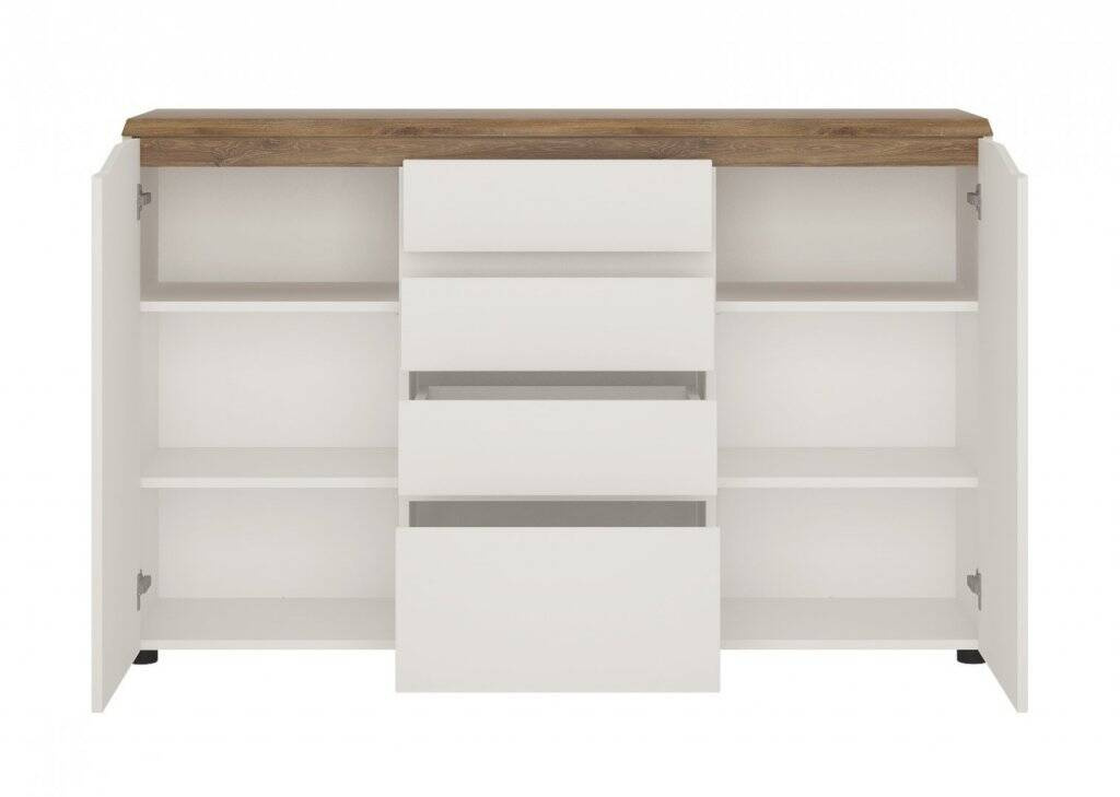 Komoda Toledo TOLK01 jest nie tylko piękna, ale i praktyczna. Sześć wnęk oraz cztery szuflady to mnóstwo przestrzeni, by schować wszelkie niezbędne drobiazgi, dokumenty czy zastawę stołową. Szczelnie zamknięte szafki ochronią Twoje rzeczy przed kurzem i pozwolą zachować w domu porządek. Na blacie z dekoru dębowego można z kolei stworzyć piękną aranżację z ulubionymi zdjęciami, książkami czy roślinami.