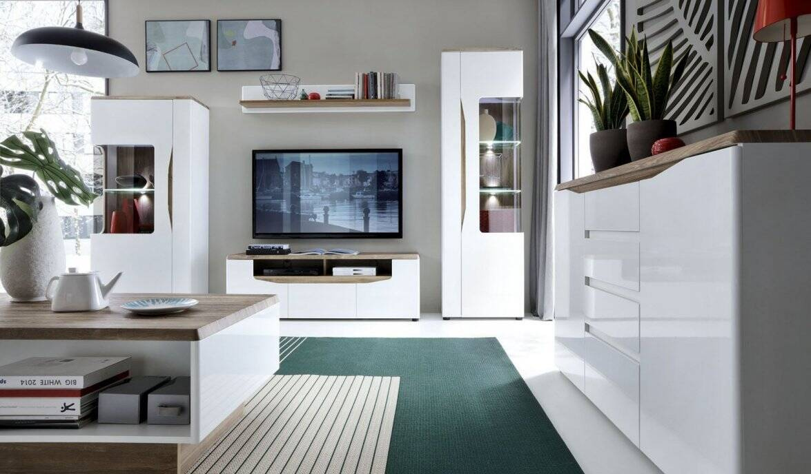- Komoda Toledo TOLK01 to połączenie eleganckiej bieli z ciepłym akcentem Dębu Stirling, oferując 6 wnęk i 4 szuflady. Stylowa i funkcjonalna, z cichym domykiem - idealna do salonu.