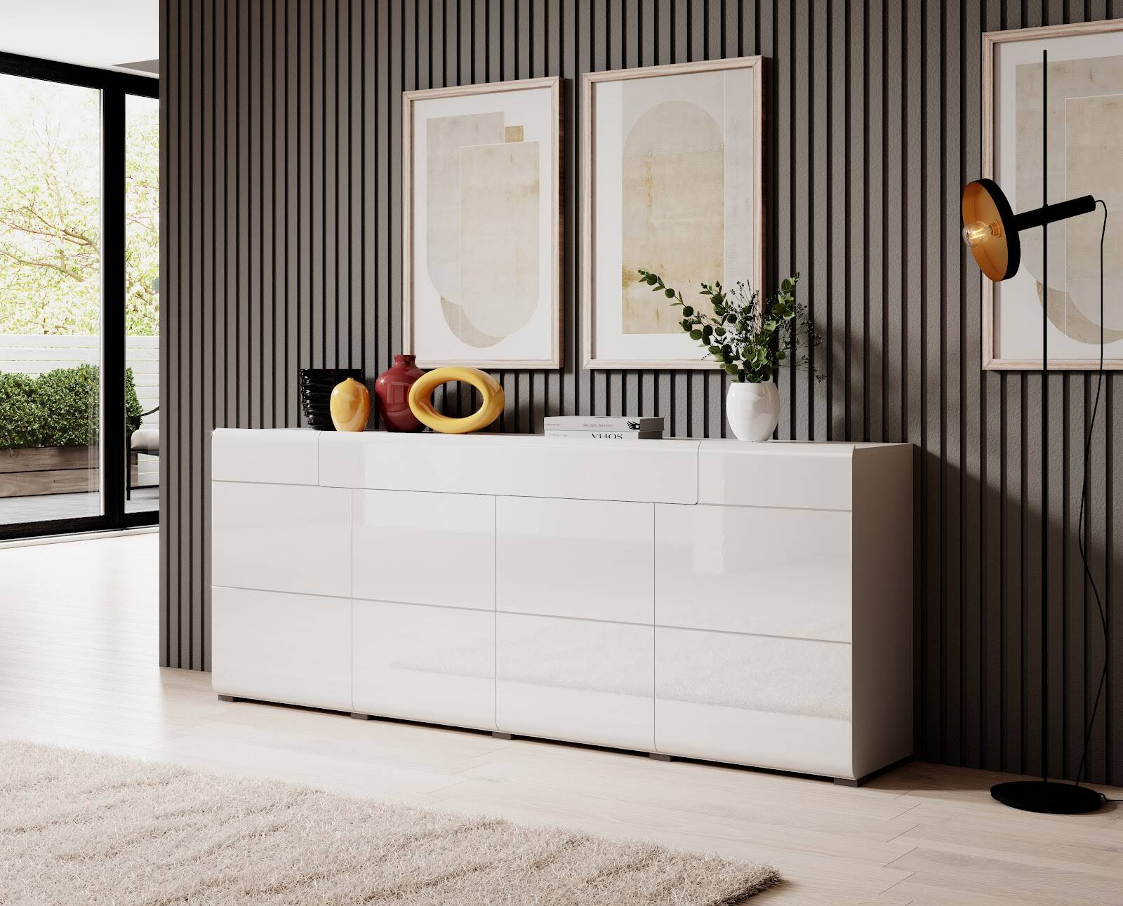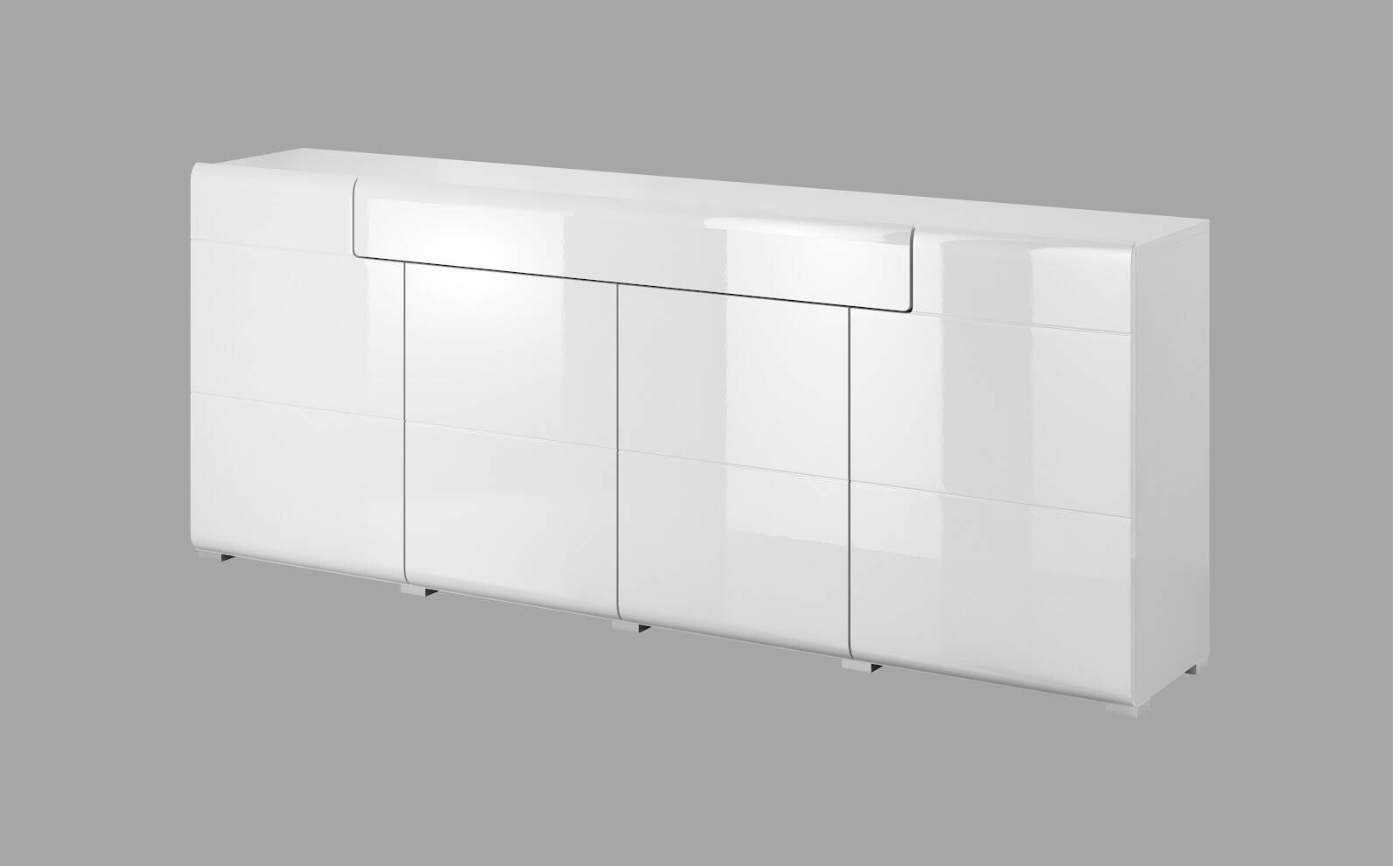 Prezentowana komoda posiada wymiary: szerokość 208 cm, wysokość 82 cm oraz głębokość 39 cm. Kolor białego połysku nadaje meblowi eleganckiego wyglądu i optycznie powiększa przestrzeń. Front wykonany z płyty MDF i korpus z płyty meblowej laminowanej gwarantują solidność oraz trwałość na lata.