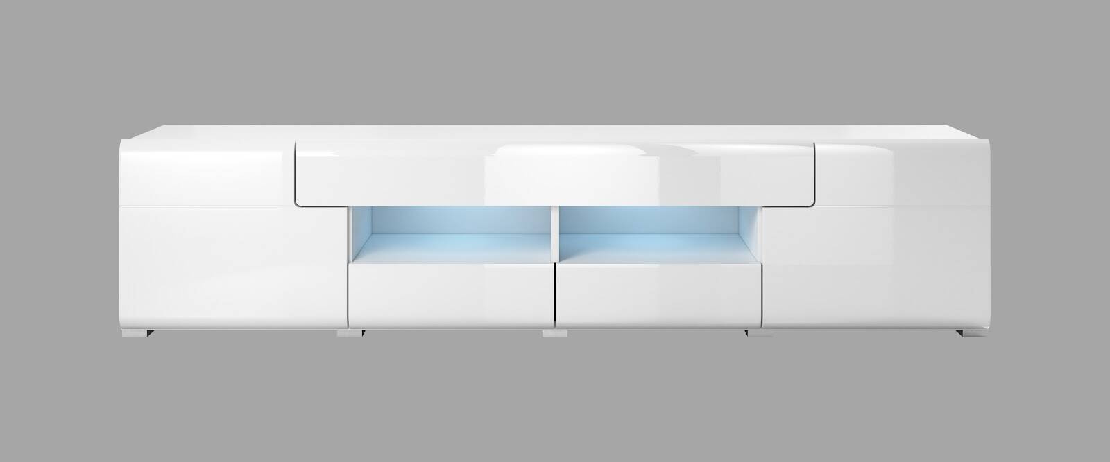 Komoda RTV Toledo WM 2D4S - elegancka i funkcjonalna w białym połysku. Wyposażona w 2 drzwi, 4 szuflady i półki zapewniające mnóstwo miejsca. Materiały: MDF i laminat. Wym: 208x47x39 cm.