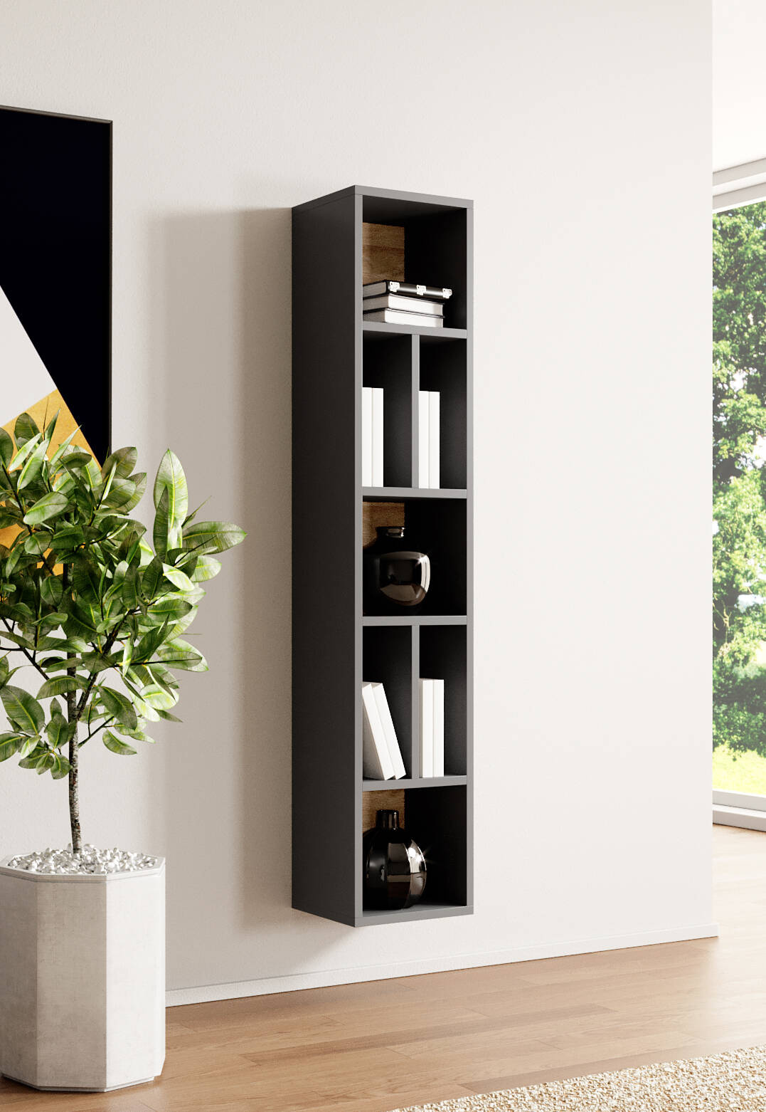 Regał został zaprojektowany tak, by oferować praktyczne i estetyczne rozwiązania do przechowywania. Cztery półki oraz siedem wnęk pozwalają na wygodne rozmieszczenie książek, dekoracji czy innych przedmiotów codziennego użytku – wszystko to w zasięgu ręki i w doskonałej organizacji.