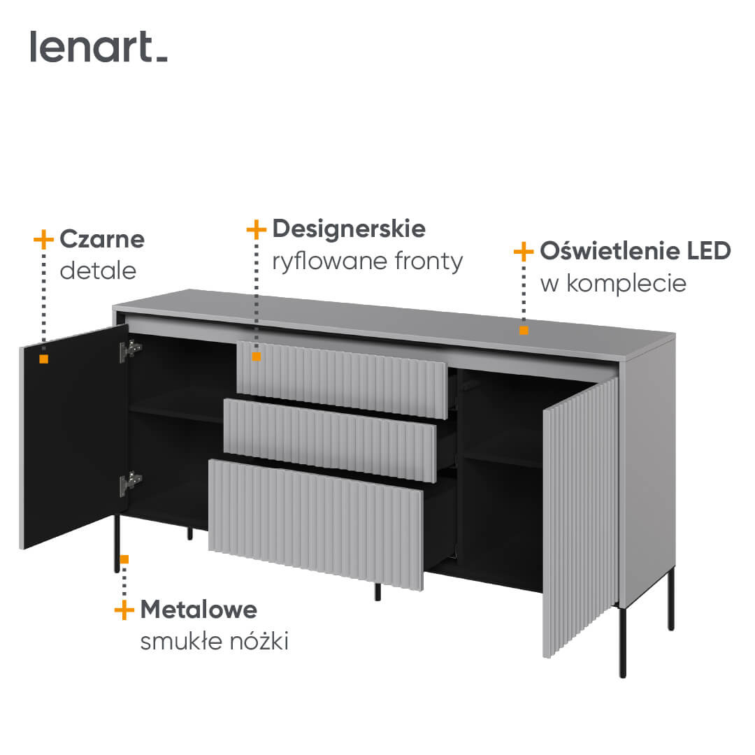 Komoda TREND TR-01 w odcieniach szarości to kwintesencja nowoczesnego stylu. Wyposażona w LED-y, ryflowane fronty i system push-open, łączy design z praktycznością.