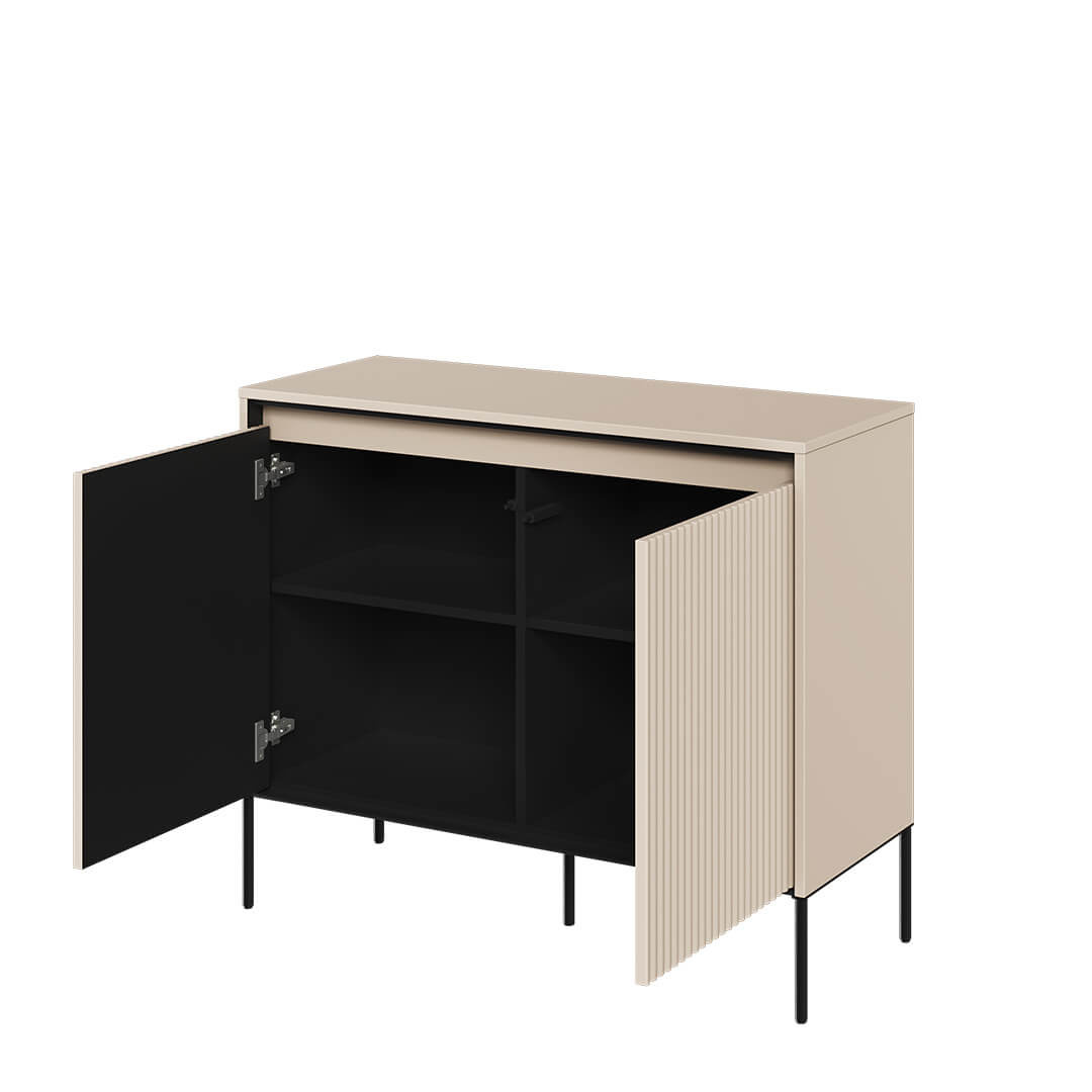 Komoda TREND TR-02 w kolorze beż piaskowym i czarnym to elegancja i funkcjonalność w jednym: ryflowane fronty, ledowe oświetlenie oraz push-open. Idealna do nowoczesnych wnętrz, zyskująca na wyrazistości przez oryginalne detale.