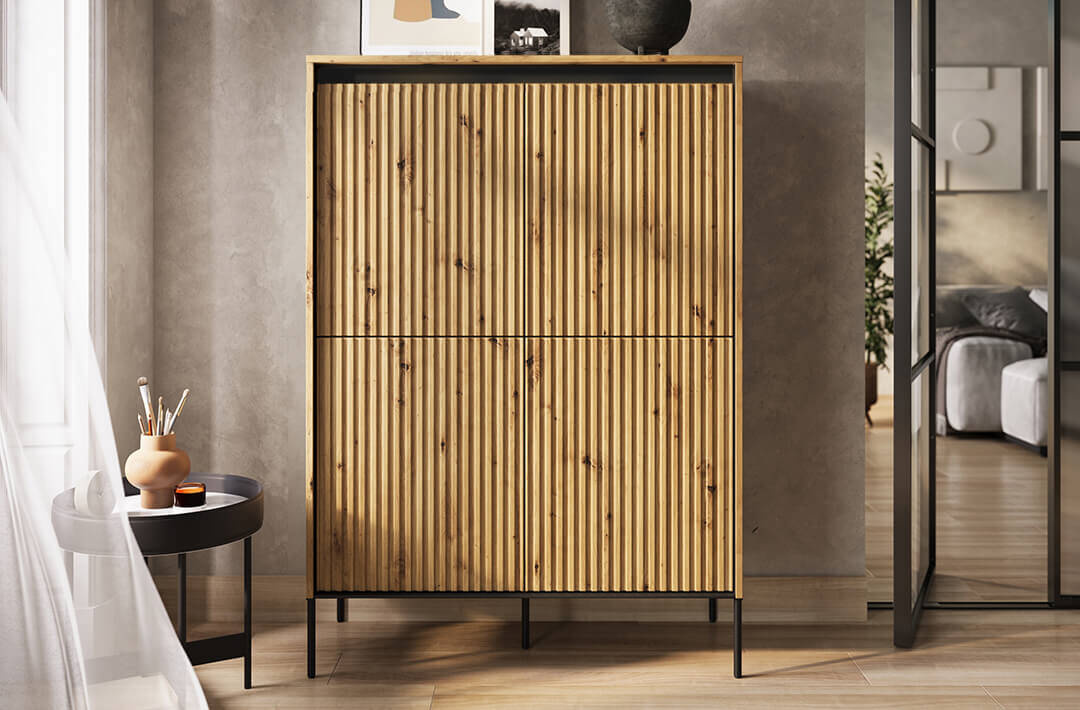 TREND TR-03 to wysoka komoda ryflowana, która dzięki swym bogato wykończonym detalom, jak frezowanie czy elegancko zakończone krawędzie, staje się nie tylko praktycznym meblem do przechowywania. Jest to równocześnie dzieło sztuki użytkowej, które ożywi każde wnętrze i doda mu ponadczasowej elegancji. Wykorzystane materiały, jak płyta wiórowa laminowana oraz płyta MDF, są trwałe i odporne na codzienne użytkowanie. Wybierając komodę TREND TR-03, stawiasz na jakość i design, które sprostają wymaganiom nawet najbardziej wymagających użytkowników.