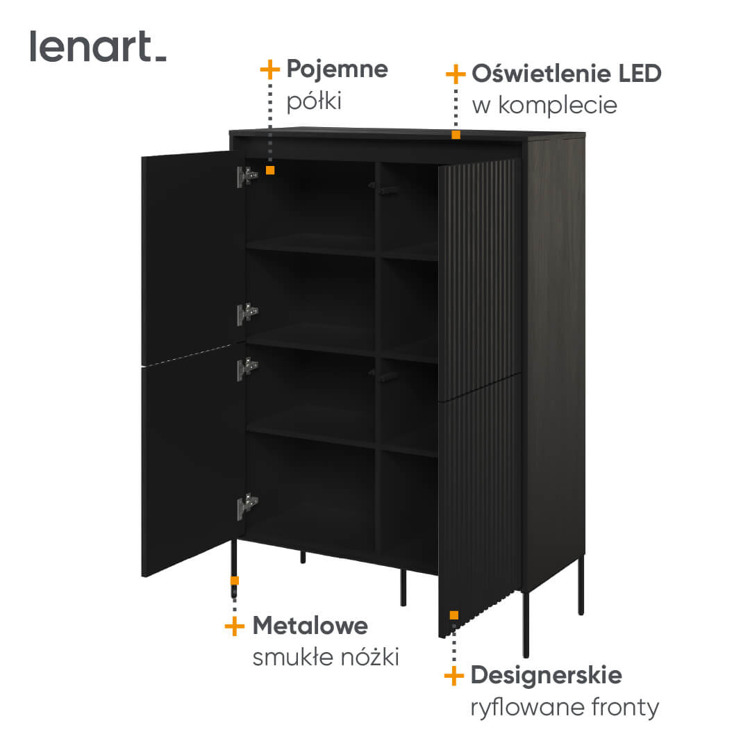 - Elegancka i praktyczna komoda TREND TR-03 w kolorze czarnym, z efektownymi ryflowanymi frontami i subtelnie akcentującym wygląd oświetleniem LED. Idealna do przechowywania, doda stylu każdemu wnętrzu.