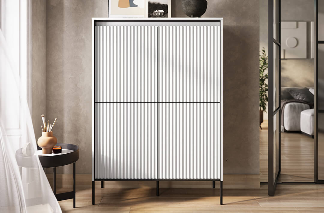 Elegancka i funkcjonalna komoda TREND TR-03 w kolorze dąb artisan z czarnymi ryflowanymi frontami. Smukłe metalowe nóżki dodają lekkości, a wkomponowane oświetlenie LED tworzy wyjątkowy nastrój.