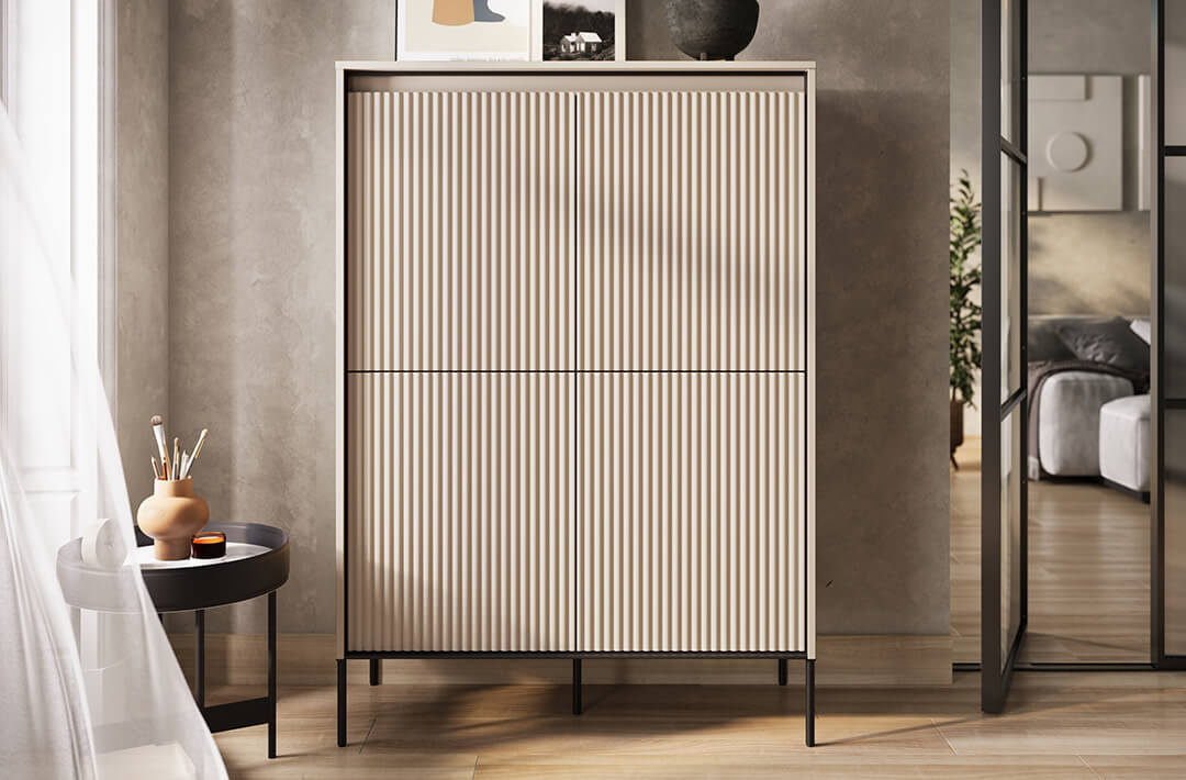 Wyrazisty design kolekcji TREND, przejawiający się w ryflowanych frontach, harmonijnie połączony z wysokiej klasy, trwałymi materiałami, tworzą mebel, który unosi estetykę przechowywania na zupełnie nowy poziom. TR-03 to symbol nowoczesnej komody, w której każdy detal – od metalowych nóg po wyrafinowane uchwyty typu push-open – został starannie przemyślany, by zapewnić najlepsze wrażenia użytkowe.