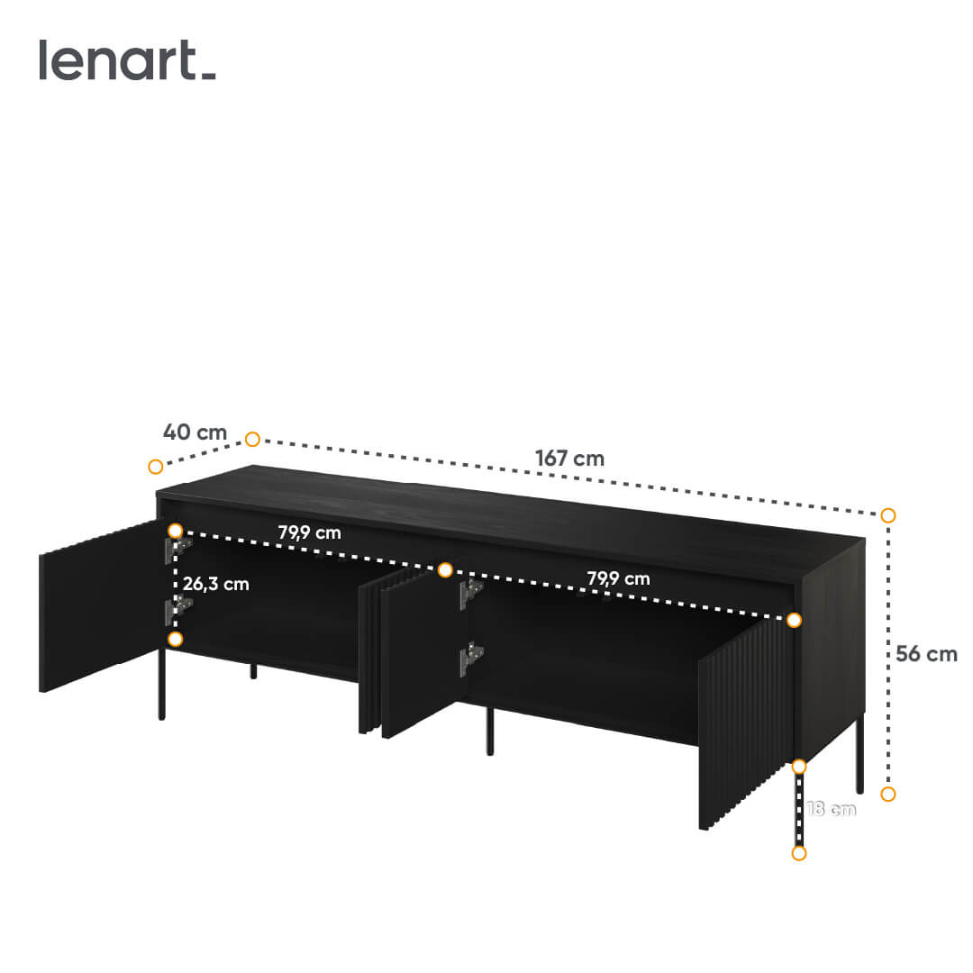 Wymiary szafki to 167 cm szerokości, 56 cm wysokości oraz 40 cm głębokości, co czyni ją idealną do przechowywania sprzętu RTV oraz innych przedmiotów. Masywna konstrukcja o wadze 35 kg opiera się na eleganckich metalowych nogach, dzięki czemu mebel prezentuje się lekko i nowocześnie. Wysoka jakość wykonania z płyty wiórowej laminowanej oraz frontów z MDF z ryflowaniem prostym nie tylko gwarantuje trwałość, ale i dodaje ekskluzywnego charakteru.