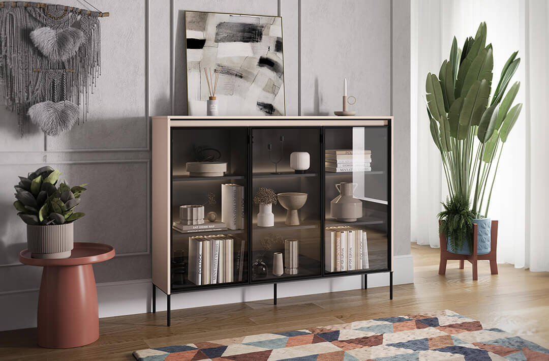 Komoda TREND TR-08 łączy nowoczesny design z funkcjonalnością – przeszklone fronty eksponują treści, zaś ledowe oświetlenie tworzy klimat. Wytrzymała, z piaskowo-czarnym wykończeniem i metalowymi nogami.