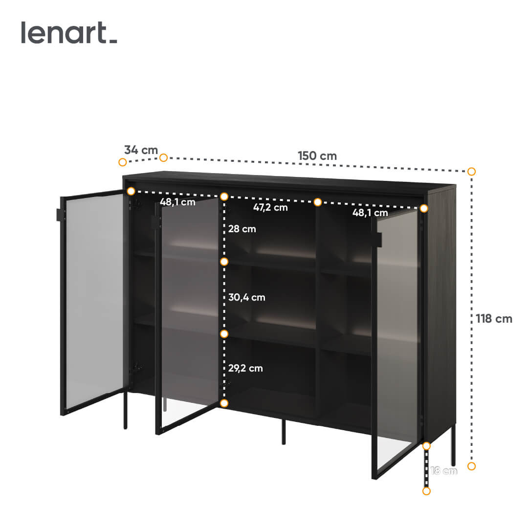 Zarówno w szerokości 150 cm, jak i w wysokości 118 cm oraz głębokości 34 cm, nasza komoda 3D udowadnia, że można połączyć przestronność z kompaktowym rozmiarem. Struktura mebla utrzymana jest w ciemnym kolorze czarnym/czarnym, który wpisuje się w stylistykę nowoczesnych wnętrz – od salonu po sypialnię. Jej stylowy wygląd podkreślają proste frezowania na froncie, a stabilność zapewniają nogi metalowe, dodające całości niebanalnego charakteru.