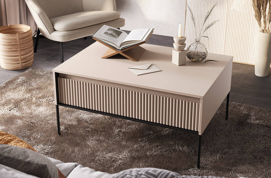 Stolik kawowy TREND TR-09 łączy nowoczesny design z funkcjonalnością. Ryflowany front i metalowe nogi nadają elegancji, dostępny w wersji beż piaskowy/czarny. Idealny punkt centralny salonu.