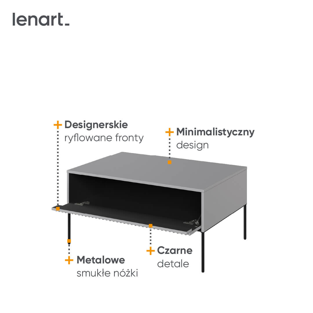 Stolik posiada funkcjonalną szafkę z jednymi drzwiami na zawiasach puszkowych clipowych, obsługiwaną systemem push-open, dzięki czemu nie potrzebuje tradycyjnych uchwytów, co jest nie tylko wygodne, ale również podkreśla minimalistyczny charakter mebla. Metalowe nogi nadają lekkości i nowoczesnego looku, a jednocześnie są gwarancją stabilności. Wykorzystanie płyty MDF do wykonania frontu z frezowaniem prostym, w kolorystyce szaro-czarnej, dodaje elegancji i sprawia, że stolik TR-09 jest wyjątkowym dodatkiem do każdego wnętrza.