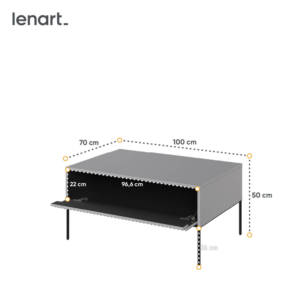 Oferowany stolik kawowy, dzięki swoim wymiarom (szerokość: 100 cm, wysokość: 50 cm, głębokość: 70 cm) i przemyślanej konstrukcji, spełni oczekiwania najbardziej wymagających użytkowników, zapewniając wygodną przestrzeń na codzienne potrzeby. Korpus i blat wykonane są z płyty wiórowej laminowanej, co gwarantuje łatwość w czyszczeniu oraz odporność na drobne zarysowania, natomiast solidne krawędzie blatu, oklejone z czterech stron, zabezpieczają przed uszkodzeniami.