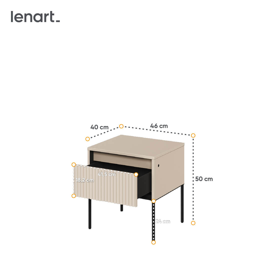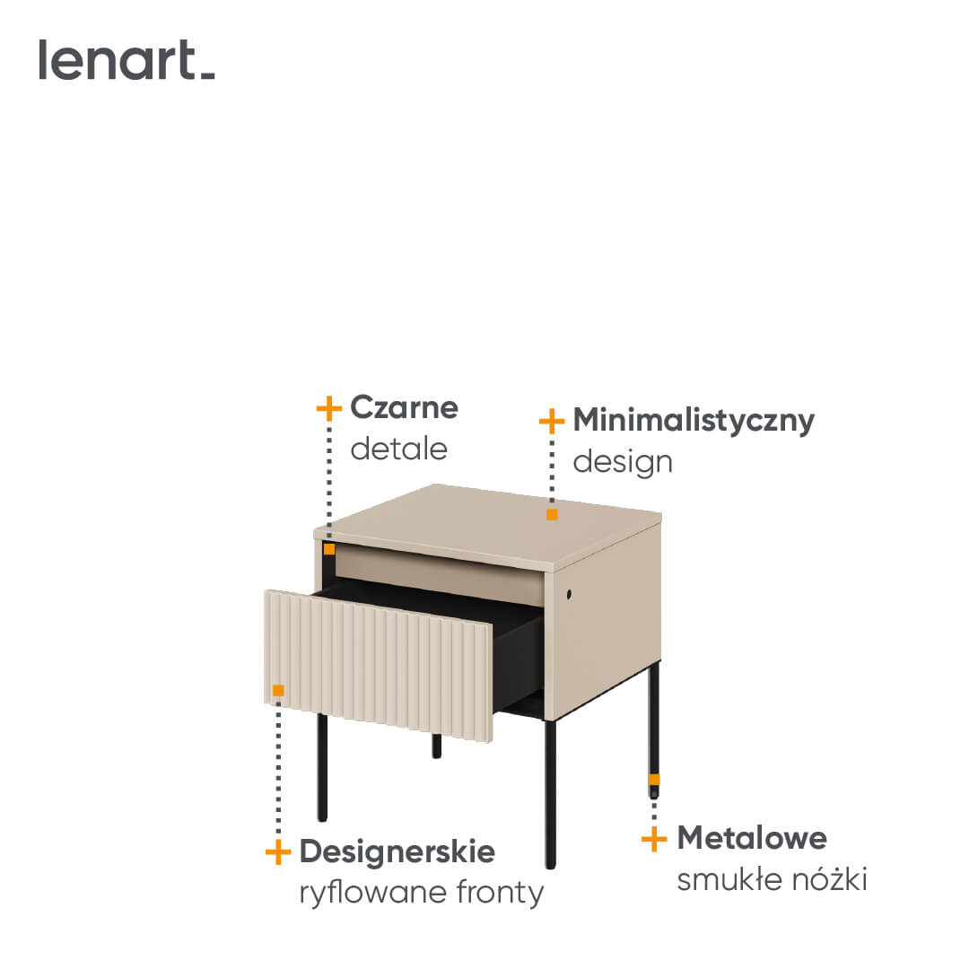 - Nowoczesny stolik nocny TREND TR-10 z podświetlanym ryflowanym frontem, doda stylu Twojej sypialni. Beżowo-czarny, z funkcją push-open, wymiary: 46x50x40cm.
