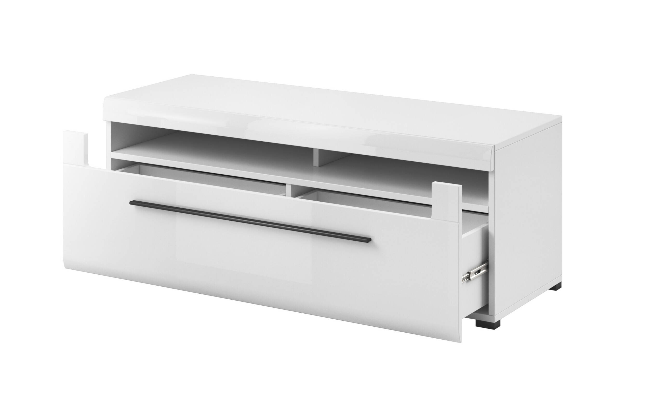 Elegancka komoda RTV Tulsa WM w bieli z połyskiem i czarnymi metalowymi uchwytami urozmaici każdy salon. Dwie pojemne szuflady i praktyczna wnęka, opcjonalne oświetlenie LED.