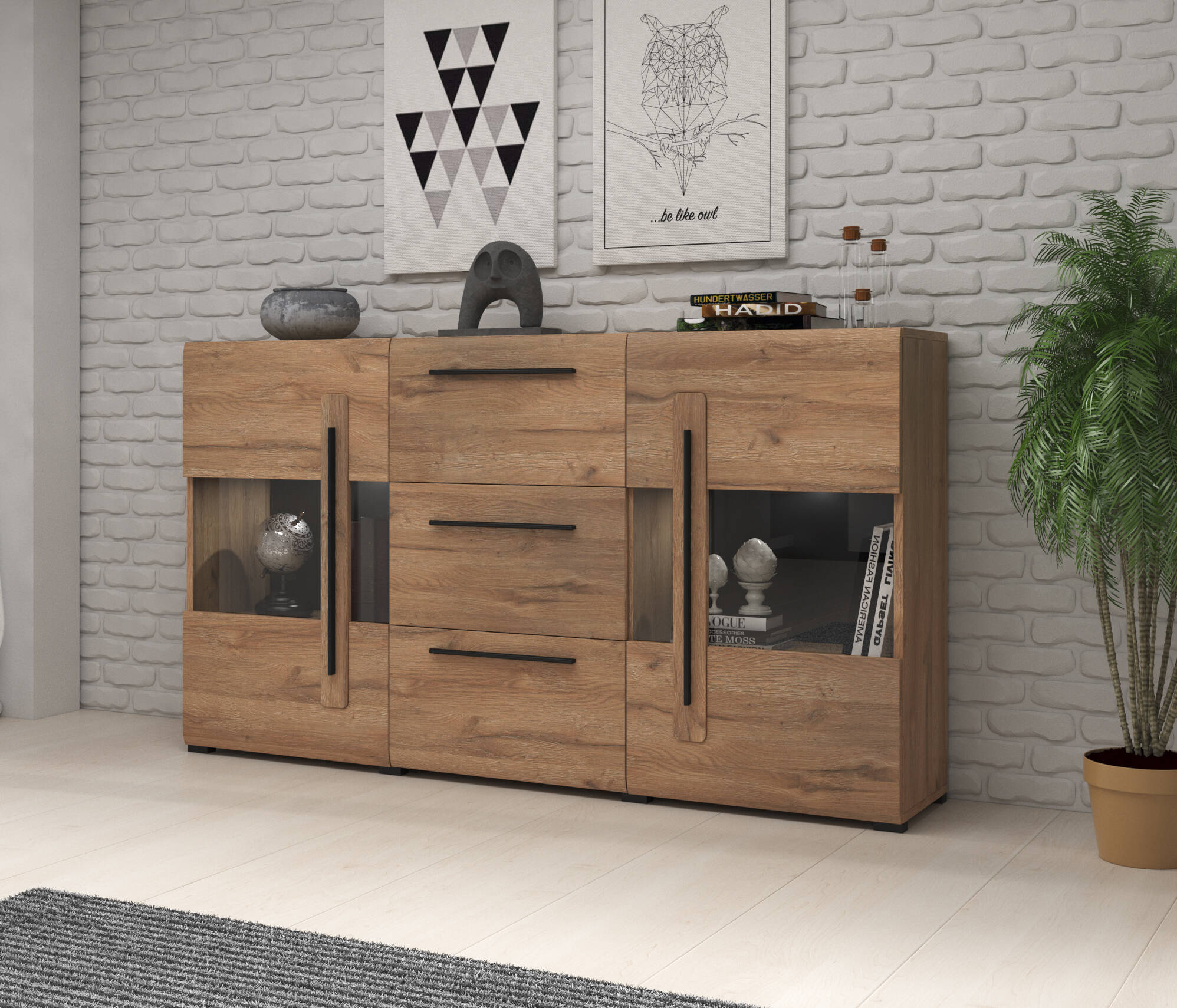 Komoda składa się z dwóch części - dwudrzwiowej, częściowo przeszklonej, która umożliwia efektowne wyeksponowanie ulubionych przedmiotów oraz pozostawienia nieco prywatności dzięki części zamykanej. Dopełnieniem konstrukcji są trzy przestronne szuflady, wyposażone w nowoczesne prowadnice kulkowe, które zapewniają cichy i komfortowy dostęp do przechowywanych rzeczy. Dodatkowo, dla miłośników detali, komoda posiada czarne, metalowe uchwyty, które stanowią eleganckie akcenty i ułatwiają otwieranie.