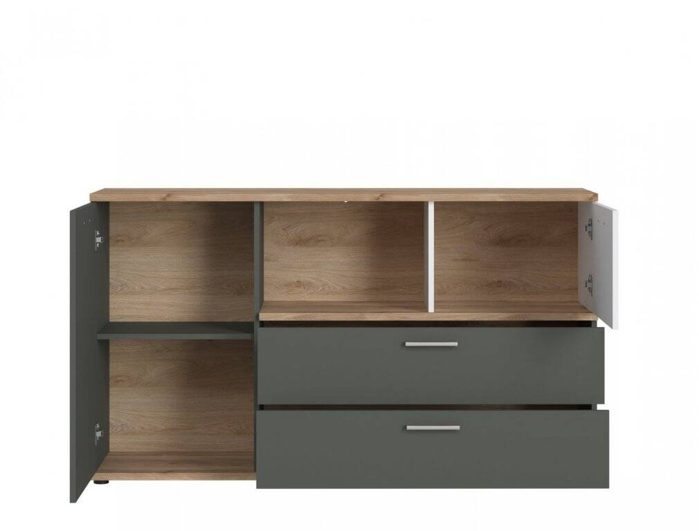 - Komoda Twenty TWEK02 łączy nowoczesny design z funkcjonalnością – wytrzymała laminowana płyta wiórowa, dwie szuflady i dwie drzwi z cichym domykiem. Estetyczna kolorystyka dębu z akcentami bieli i grafitu pasuje do różnorodnych aranżacji.