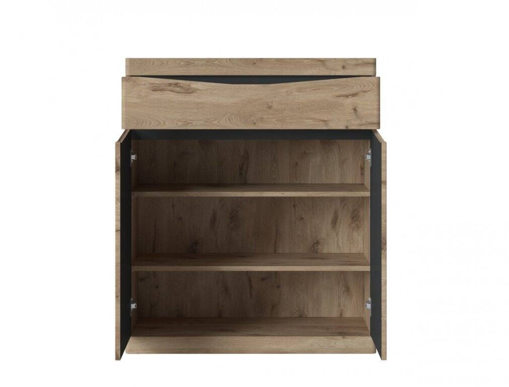 Komoda Twist SUMGK1 w odcieniu Dąb Viking/Antracyt łączy nowoczesny design z funkcjonalnością. Praktyczne półki za bezuchwytowymi frontami i pojemna szuflada z cichym domykiem idealnie wpiszą się w każde wnętrze.