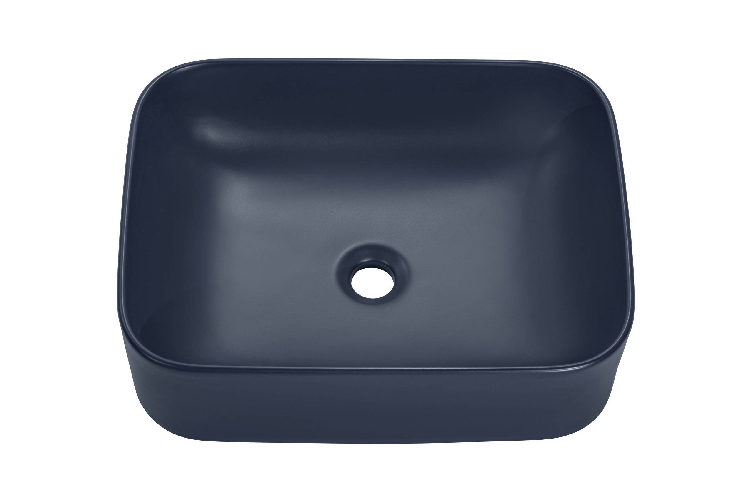 Umywalka nablatowa o szerokości 50,5 cm wykonana z wysokiej jakości ceramiki w kolorze granatowym. Powierzchnia matowa.