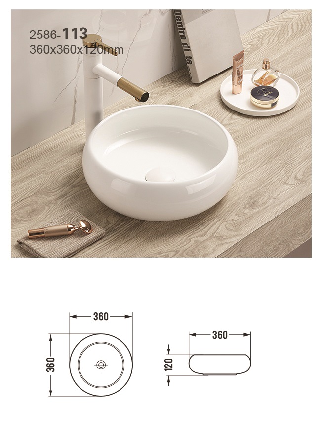 - Umywalka nablatowa o szerokości 36 cm okrągła wykonana z wysokiej jakości ceramiki w kolorze białym. Powierzchnia połyskująca.