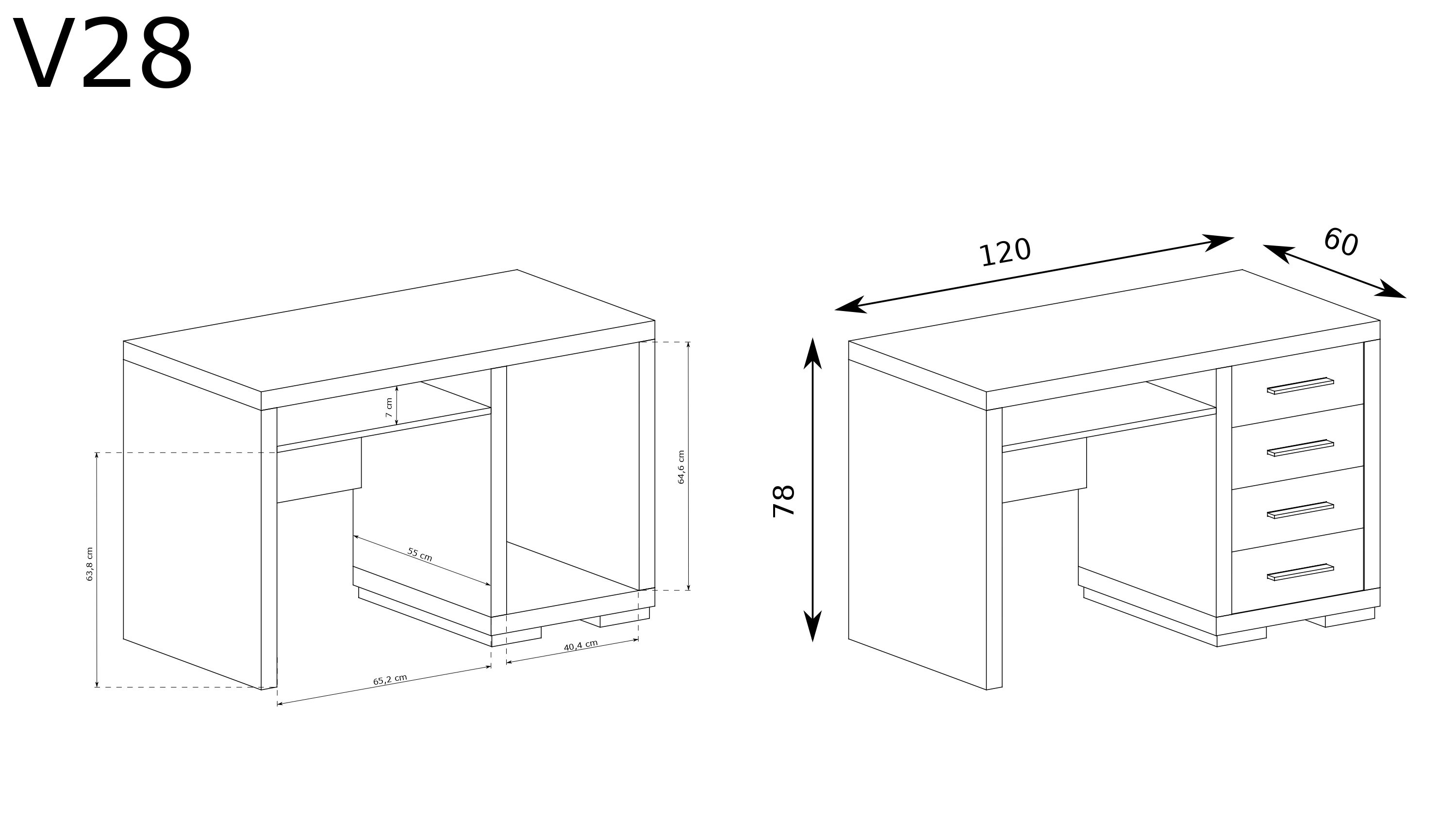 Biurko VEGAS-28 to idealne rozwiązanie do pracy i organizacji. Cztery pojemne szuflady pomieszczą dokumenty, a wysuwana półka ułatwi dostęp do klawiatury.Przykuwające uwagę metalowe uchwyty dodają mu charakteru. Pasuje do biura, gabinetu, salonu.