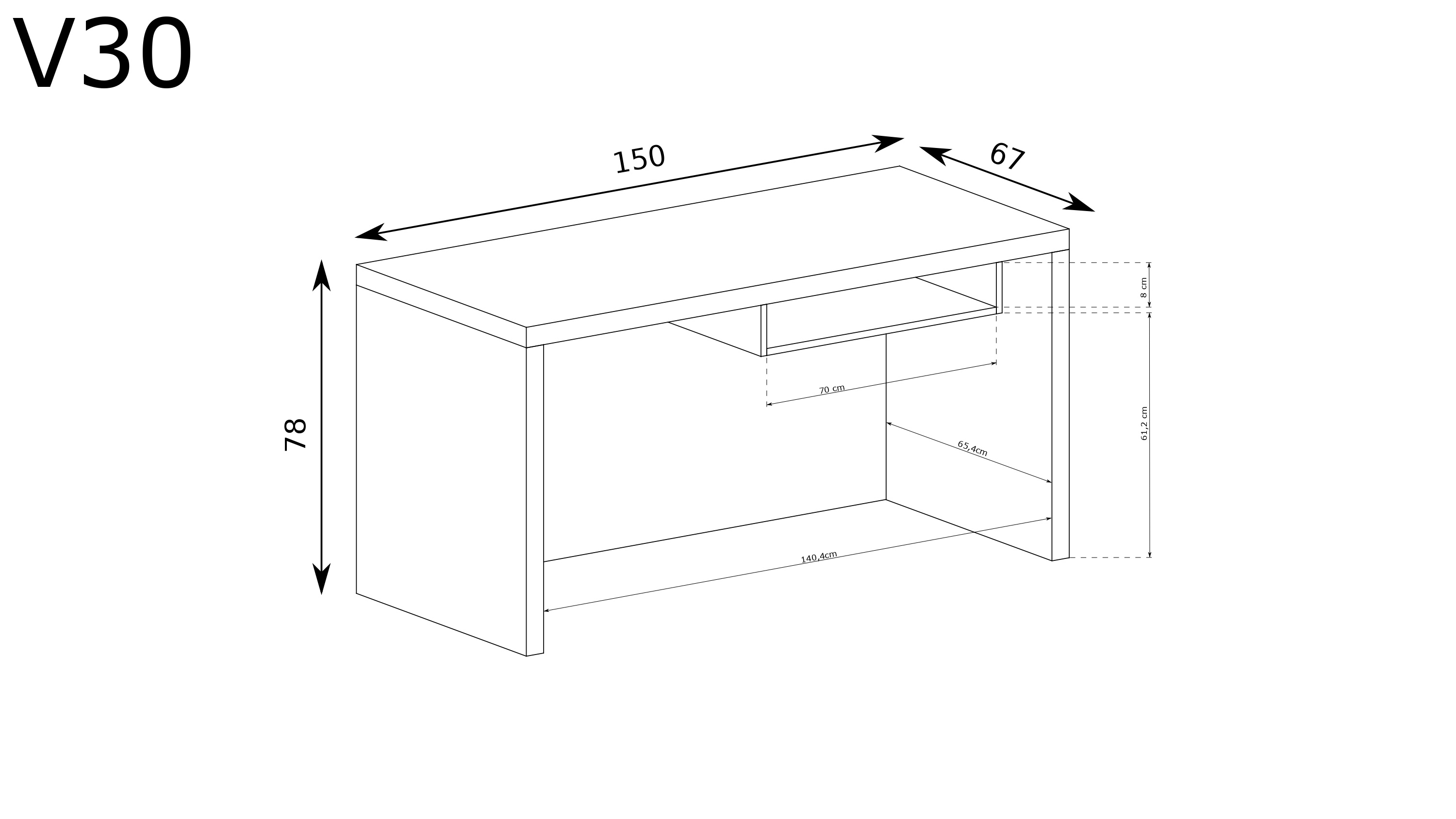 Oferując wygodę użytkowania, biurko VEGAS-30 posiada jedną wysuwaną półkę, idealną do przechowywania klawiatury lub najważniejszych dokumentów. Dzięki temu możesz zyskać zorganizowane i przestrzenne miejsce do pracy czy nauki. Jego szerokość 150 cm zapewnia wystarczająco dużo powierzchni roboczej, co czyni go doskonałym wyborem zarówno do salonu, jak i gabinetu czy biura.