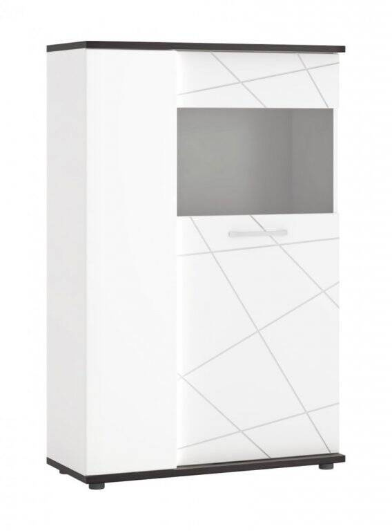 Elegancka witryna Venezia w białym połysku z kontrastującymi detalami w dębie Vicenza. Kompaktowa i pojemna, z subtelnym oświetleniem LED i systemem cichego domyku.