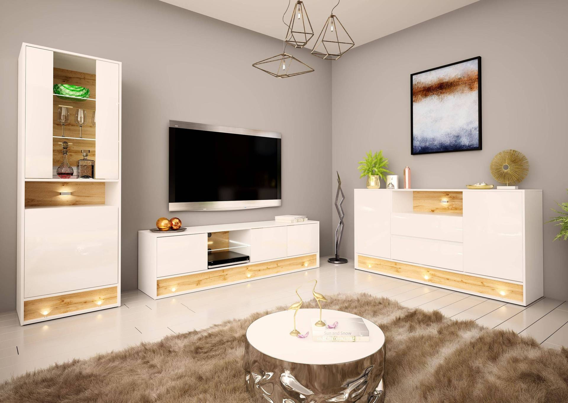 Elegancka komoda RTV VISION-01 łączy w sobie biały mat, Dąb Wotan i połysk, tworząc nowoczesny design. Wyposażona w oświetlenie LED, system push to open i cichy domyk. Idealna do nowoczesnych wnętrz, zrobiona z płyty MDF i laminowanej.