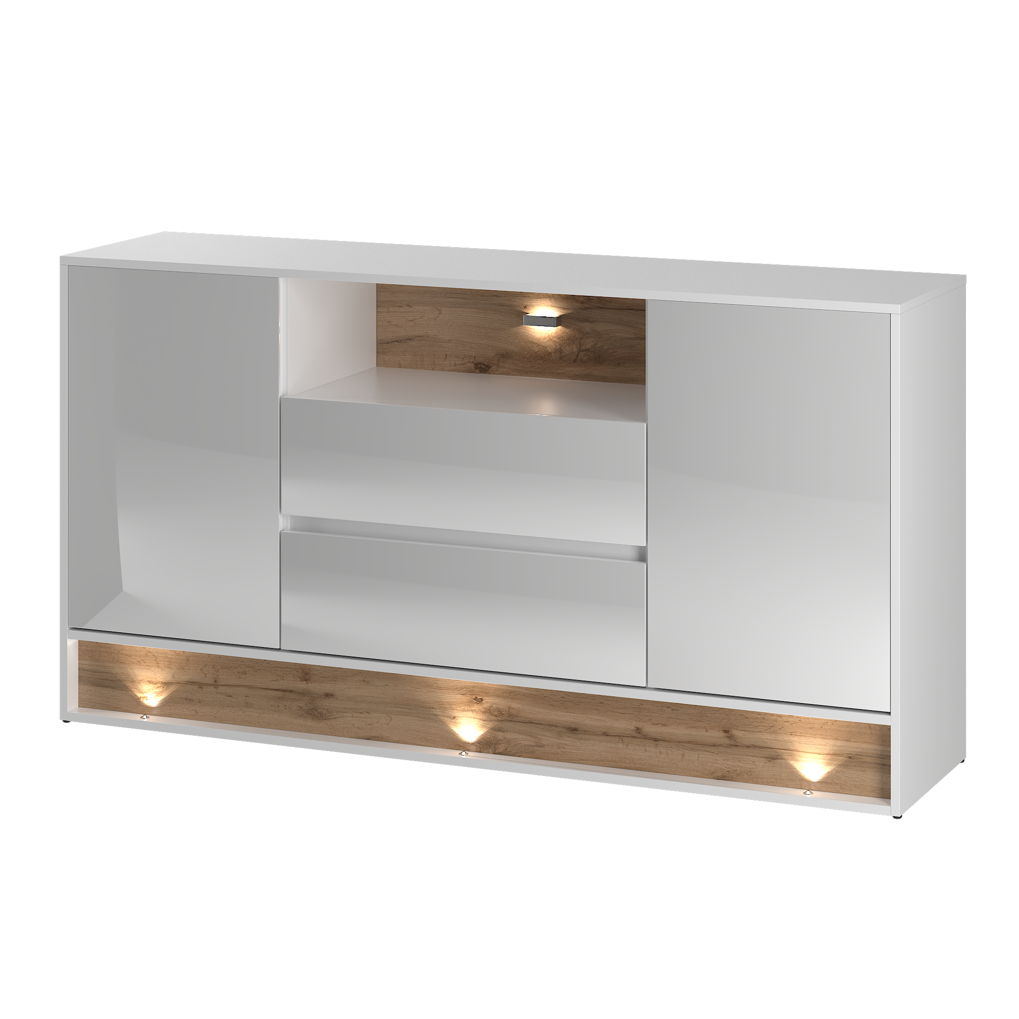 Elegancka komoda VISION-02 z dwoma drzwiami i dwoma szufladami. Wykonana z płyty MDF i laminowanej. Wysokiej jakości przesuwy kulkowe i zawiasy puszkowe z cichym domykiem. Stylowy biały mat z dębem Wotan i podświetleniem LED tworzy luksusowy wygląd.
