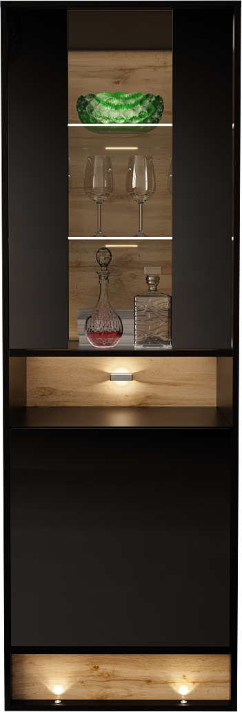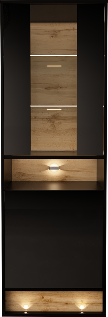 - Witryna VISION-04 Megstyl to nowoczesny design z eleganckim połączeniem matowego czarnego i Dąb Wotan. Wyposażona w LED i szkło hartowane. System push-to-open oraz cichy domyk zapewniają komfort użytkowania. Idealna do stylowych wnętrz.