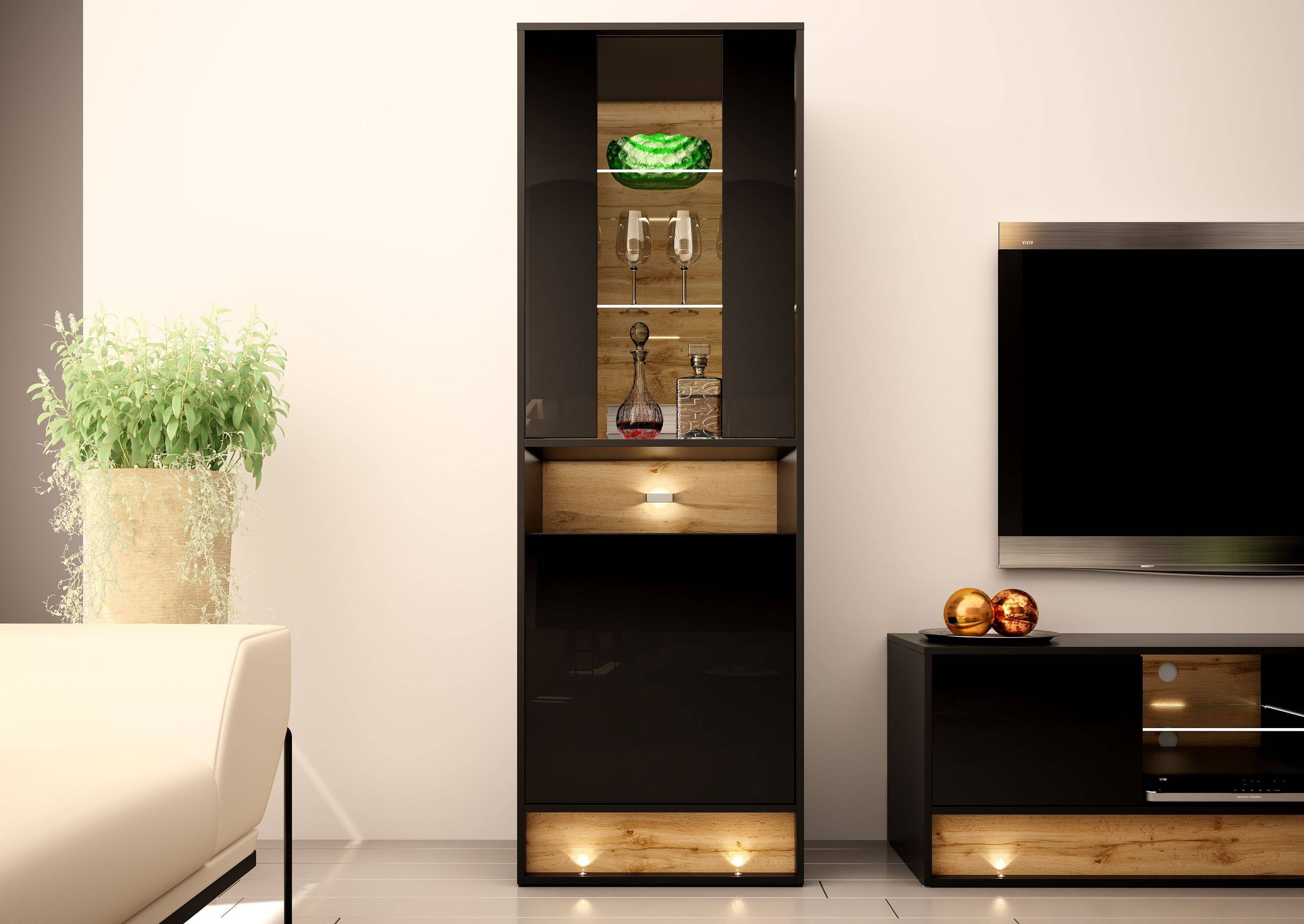 VISION-04 - Witryna 2D z Oświetleniem LED Czarny Mat Dąb Wotan Mat Czarny Połysk