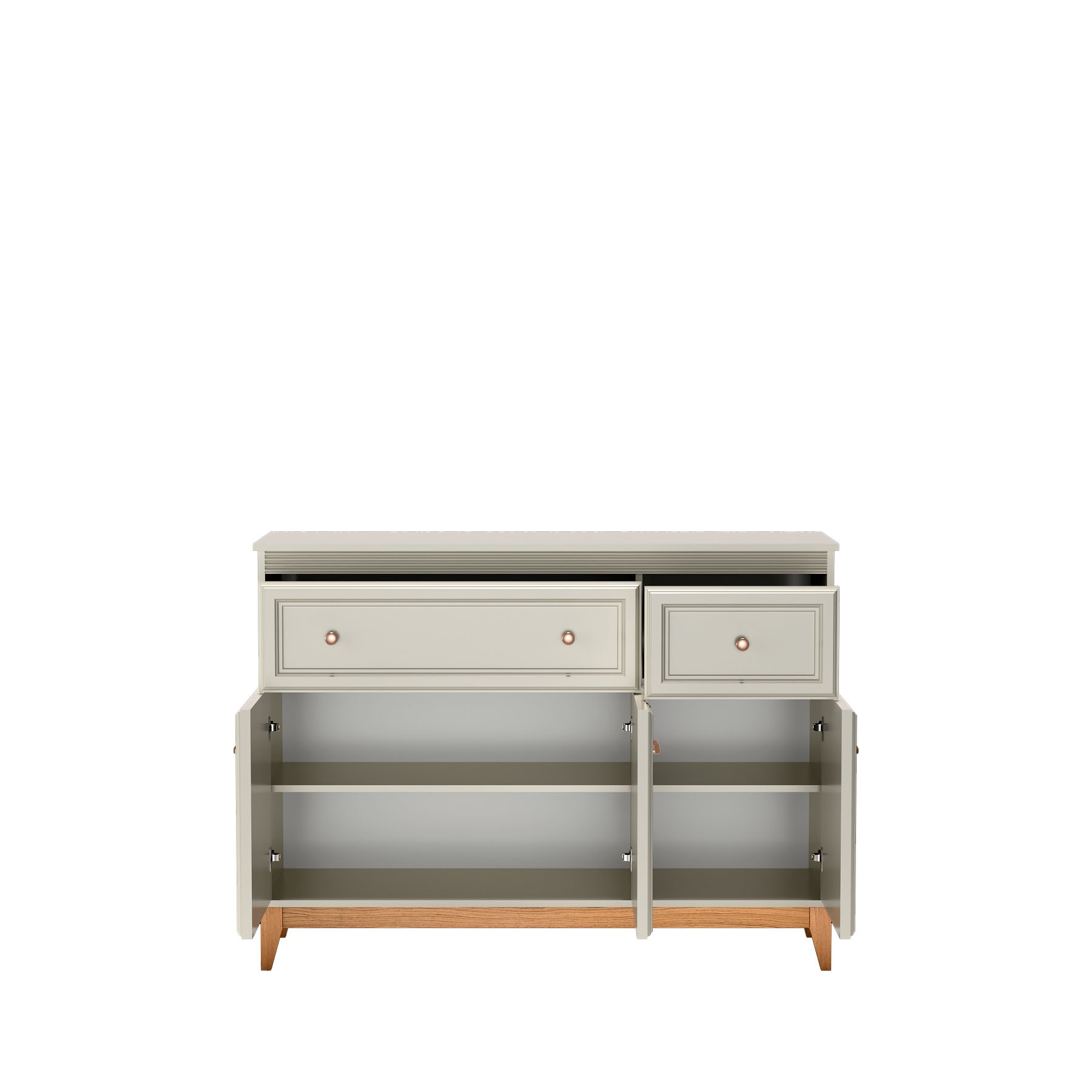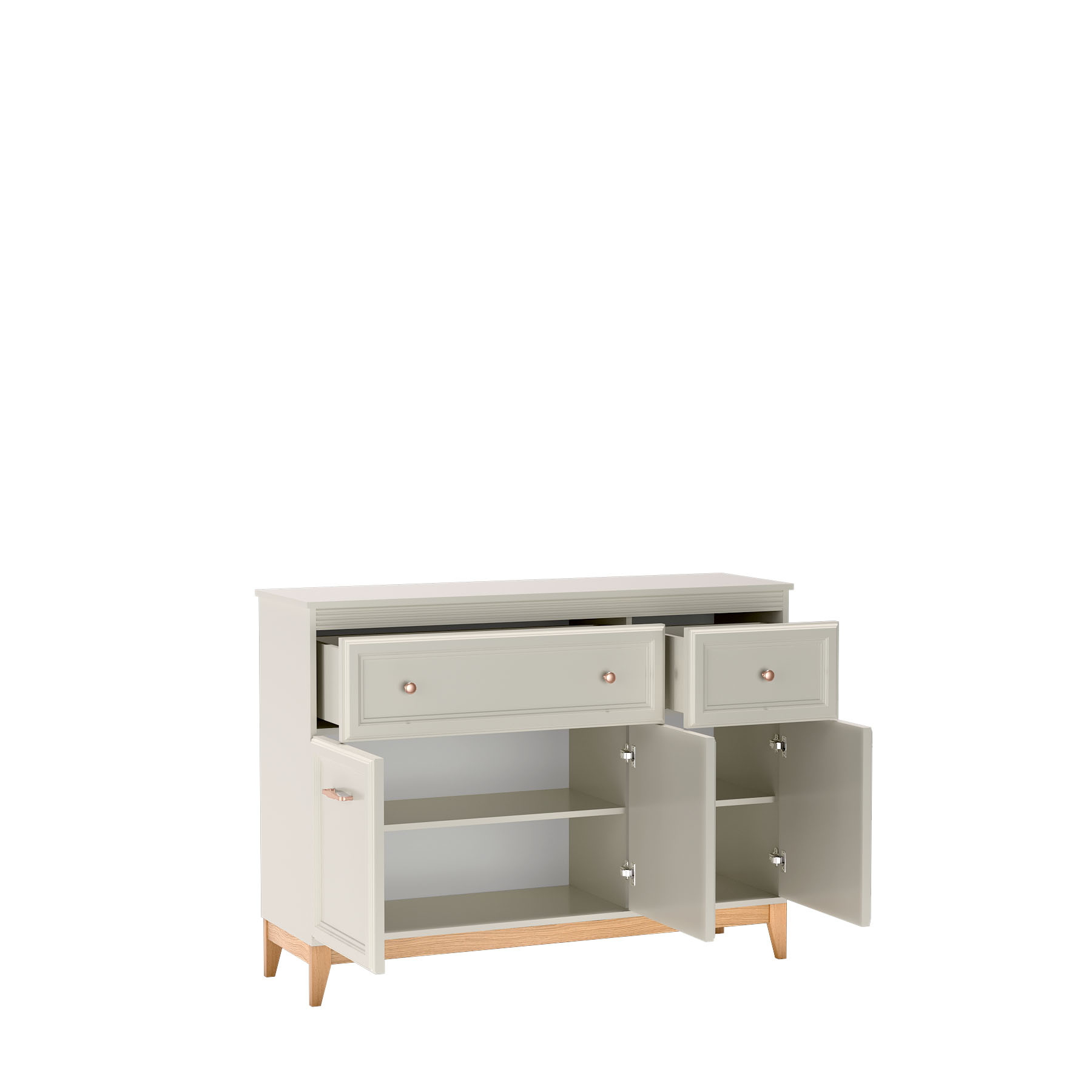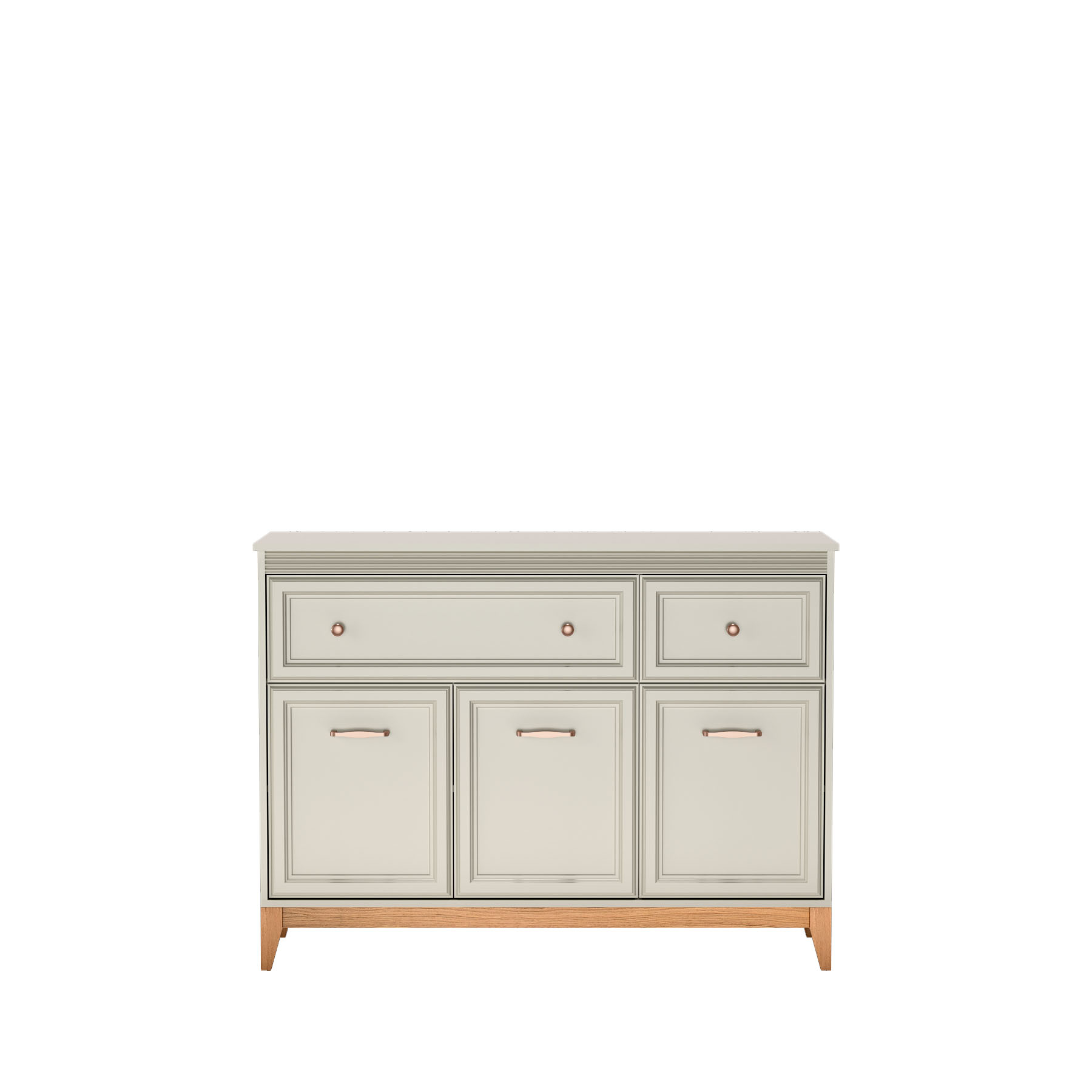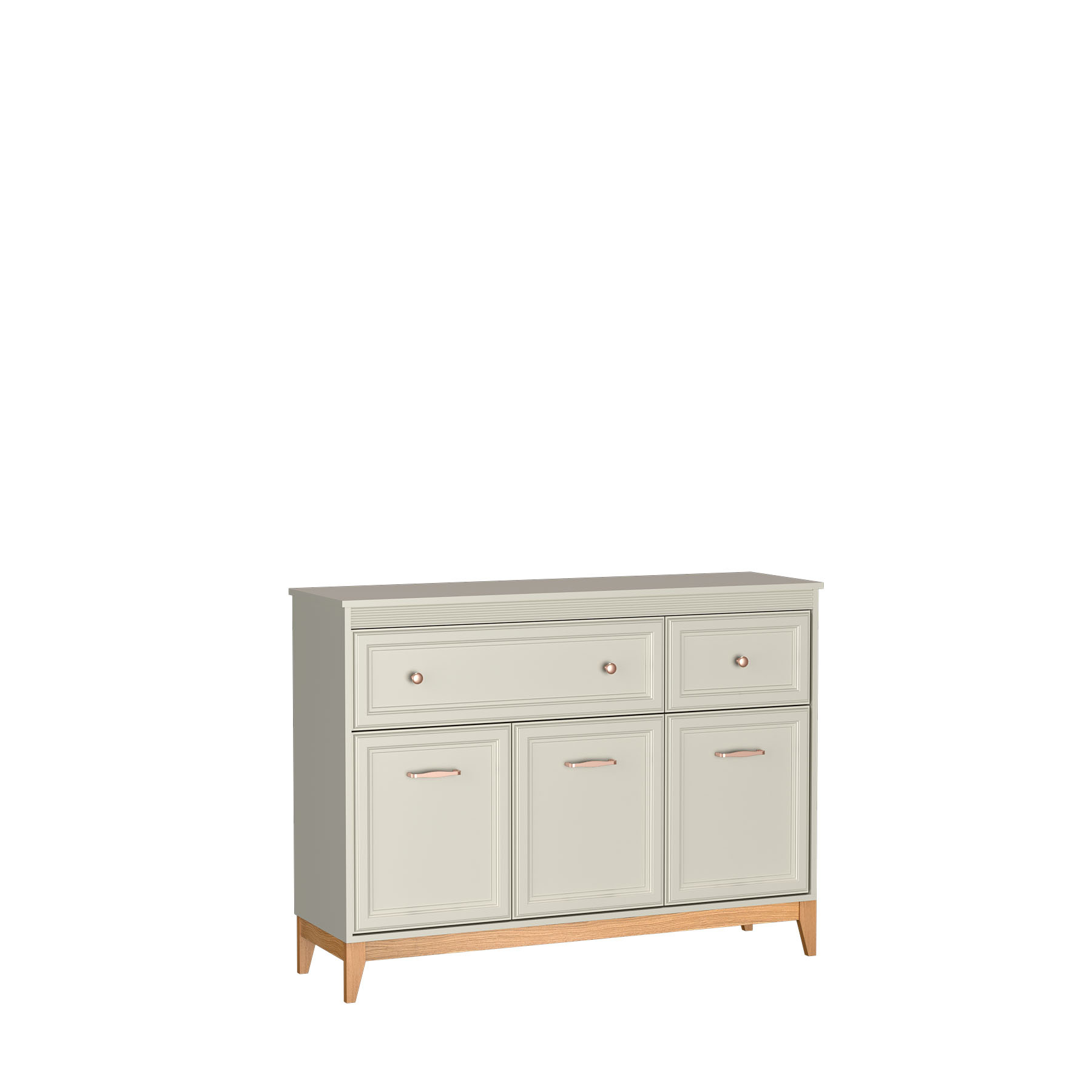 Komoda Windsor-1 3D2S to połączenie klasycznej elegancji i funkcjonalności. W odcieniu kaszmiru i z miedzianymi uchwytami, wpasuje się w każde wnętrze. Cichy domyk i solidne dębowe nogi zapewniają trwałość i komfort użytkowania. Idealna do Twojego domu.