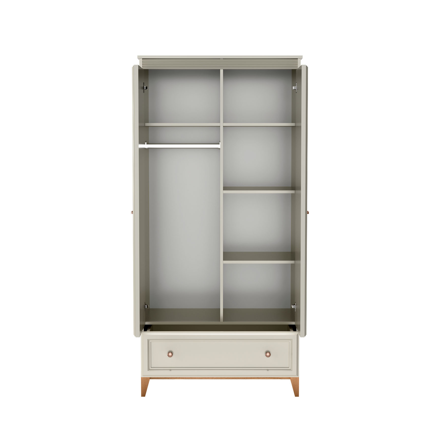 Wnętrze szafy zostało zaprojektowane z myślą o maksymalnej funkcjonalności. Oferuje optymalną organizację miejsca, co pozwala na łatwe utrzymanie porządku i szybkie odnajdywanie potrzebnych rzeczy. To doskonały sposób na stworzenie harmonijnego i zorganizowanego środowiska, które wspiera codzienne życie oraz podkreśla estetykę otoczenia. Dzięki temu szafa WINDSOR-10 staje się nie tylko meblem, ale również istotnym elementem dekoracyjnym w każdym pomieszczeniu.