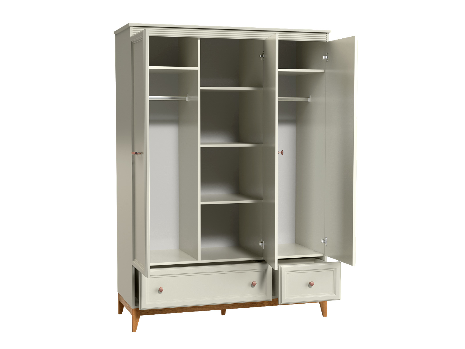 Szafa WINDSOR W-15 to połączenie elegancji i funkcjonalności. Trzydrzwiowa konstrukcja z lustrem, drewnianymi nogami i miedzianymi uchwytami, oferuje przemyślany układ wnętrza z pojemnymi półkami i szufladami. Idealna do klasycznych wnętrz!