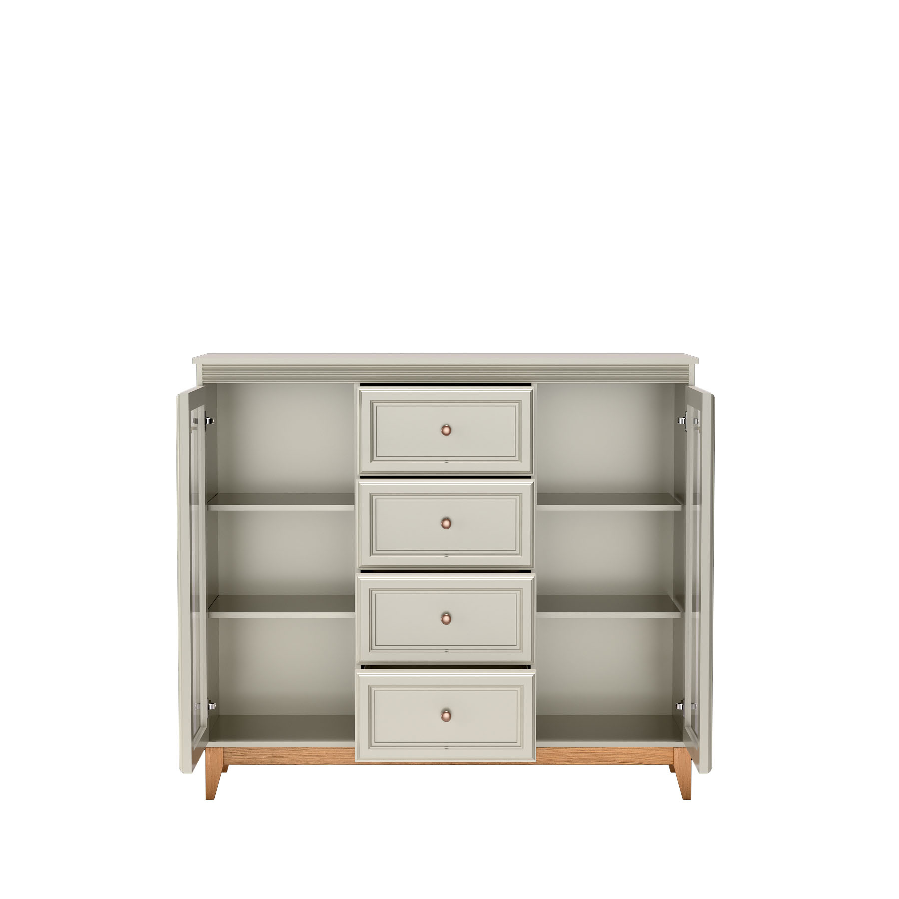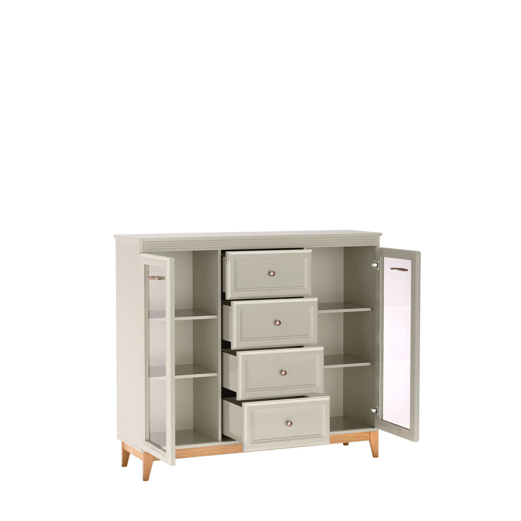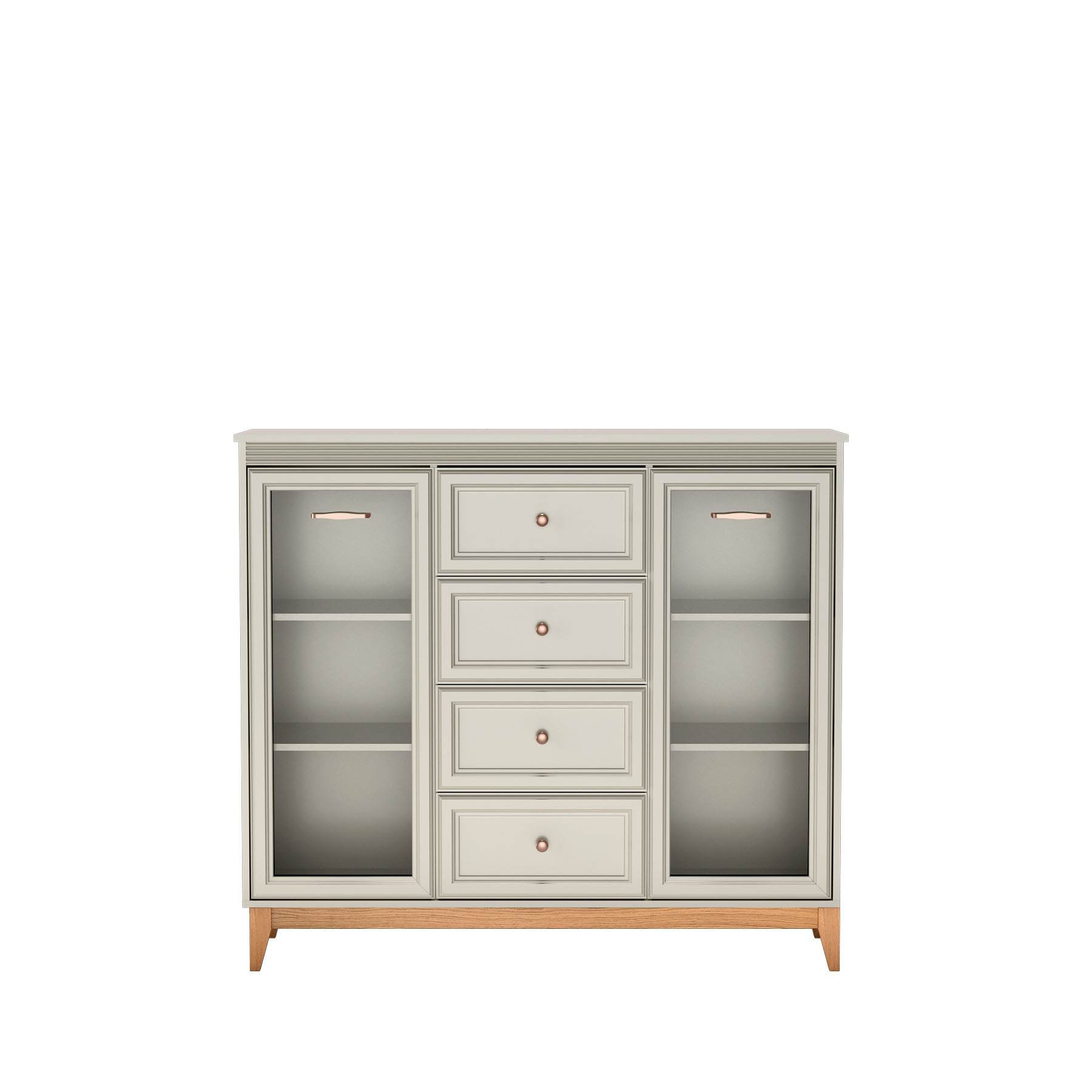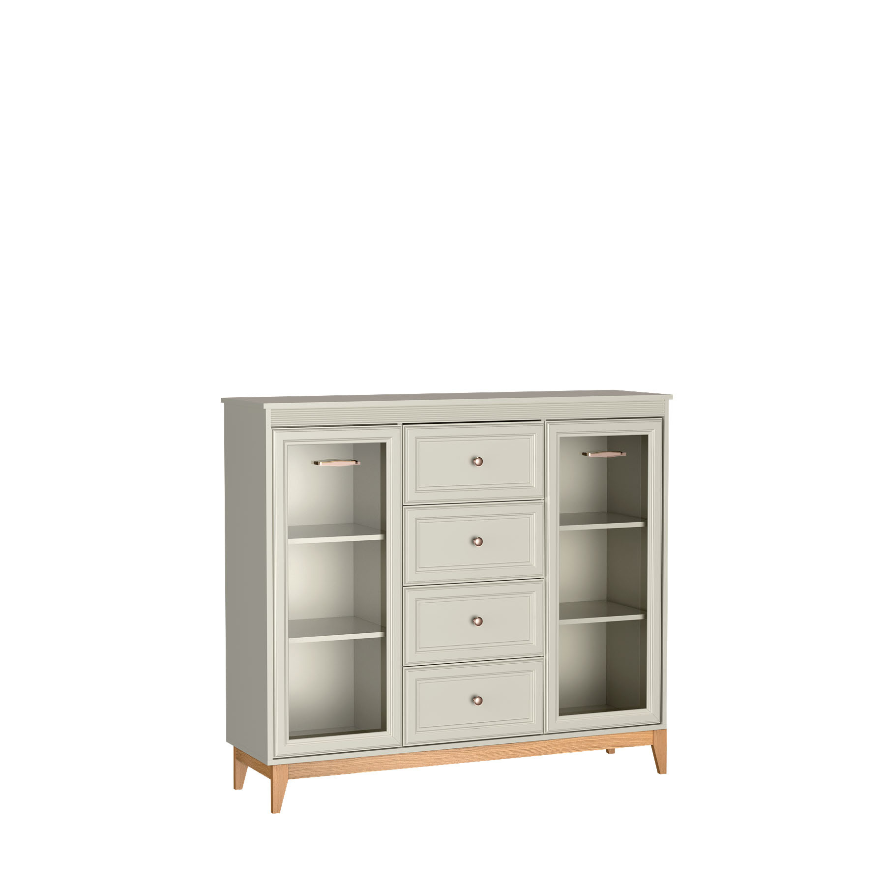 Witryna WINDSOR-7 w kolorze kaszmiru, wyróżnia się subtelnością i ponadczasowym stylem, doskonale wkomponowując się w różnorodne aranżacje. Jej nowoczesny design, wzbogacony drewnianymi akcentami, sprawia, że każda przestrzeń nabiera ciepłego, przytulnego charakteru.