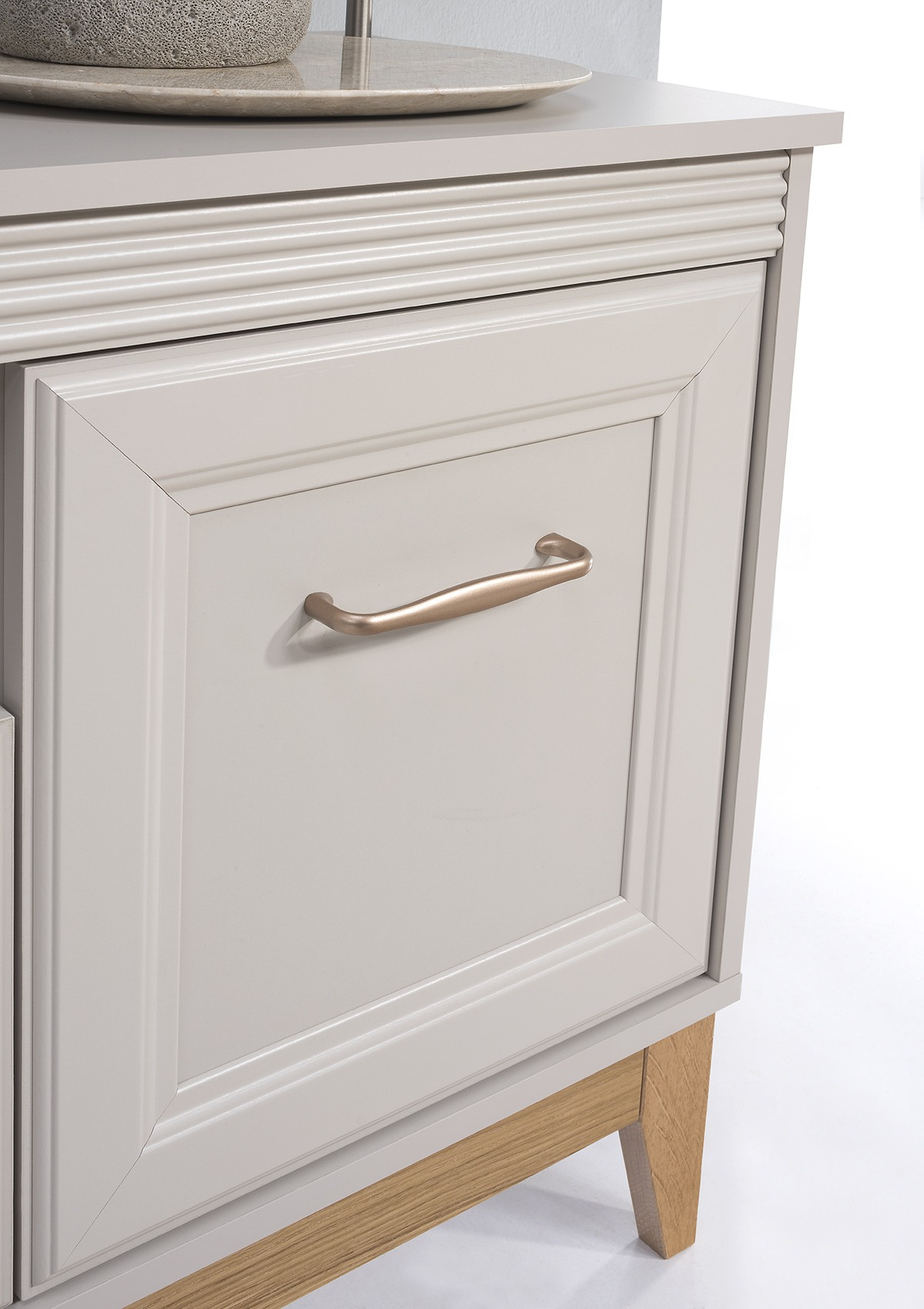 Kolejnym elementem przyciągającym uwagę są subtelne uchwyty w miedzianej tonacji, które dodają całości nowoczesnego wyrazu. To właśnie detale, takie jak te, wpływają na ostateczny efekt wizualny, czyniąc szafkę WINDSOR - 9 elementem, który może przyciągać wzrok i stawać się centralnym punktem aranżacji salonu. Miedziane akcenty pięknie kontrastują z delikatnym kolorem korpusu, tworząc harmonijną kompozycję.