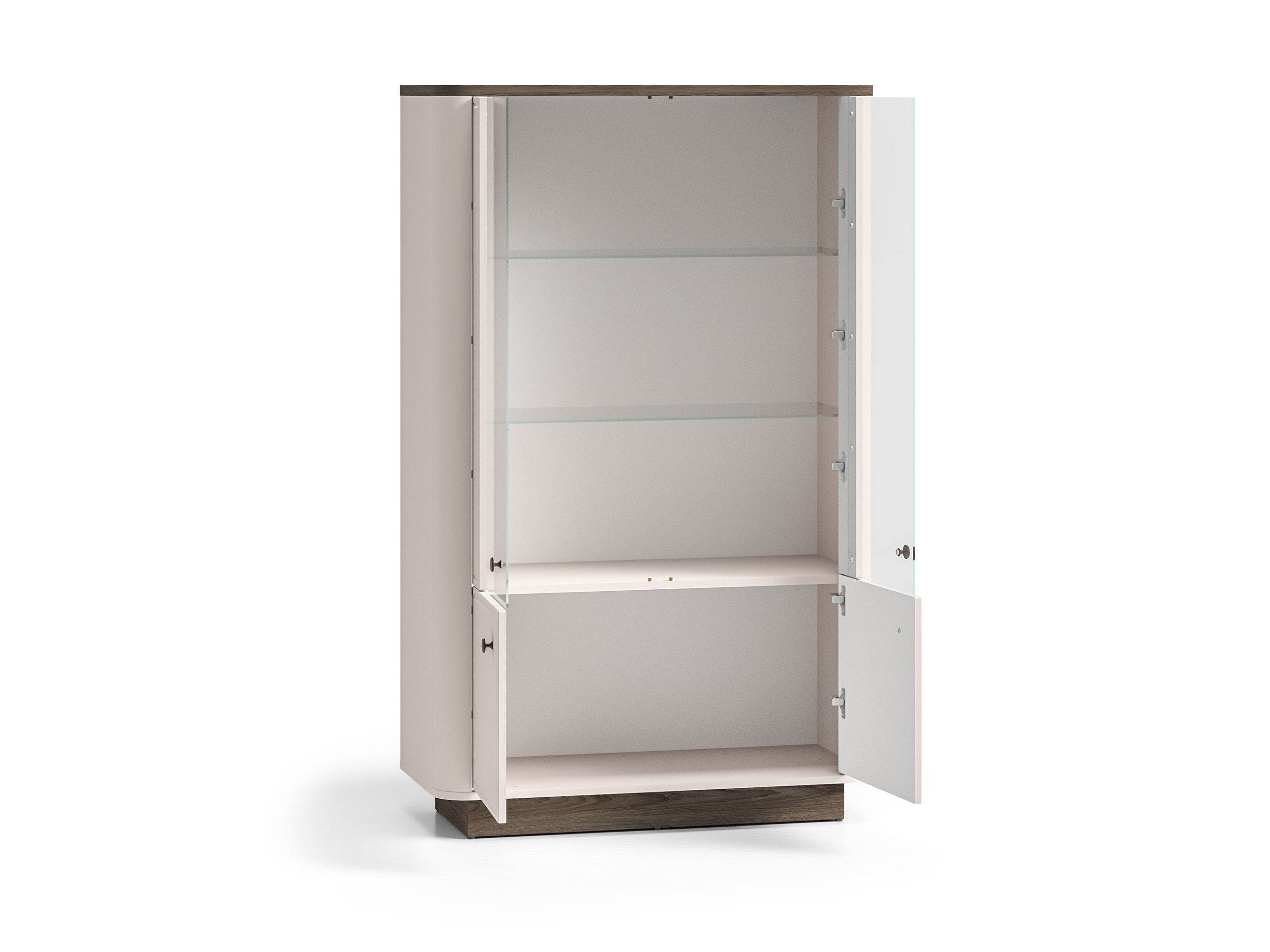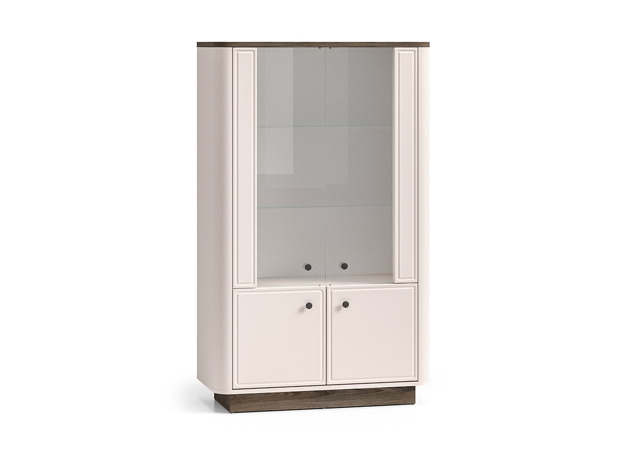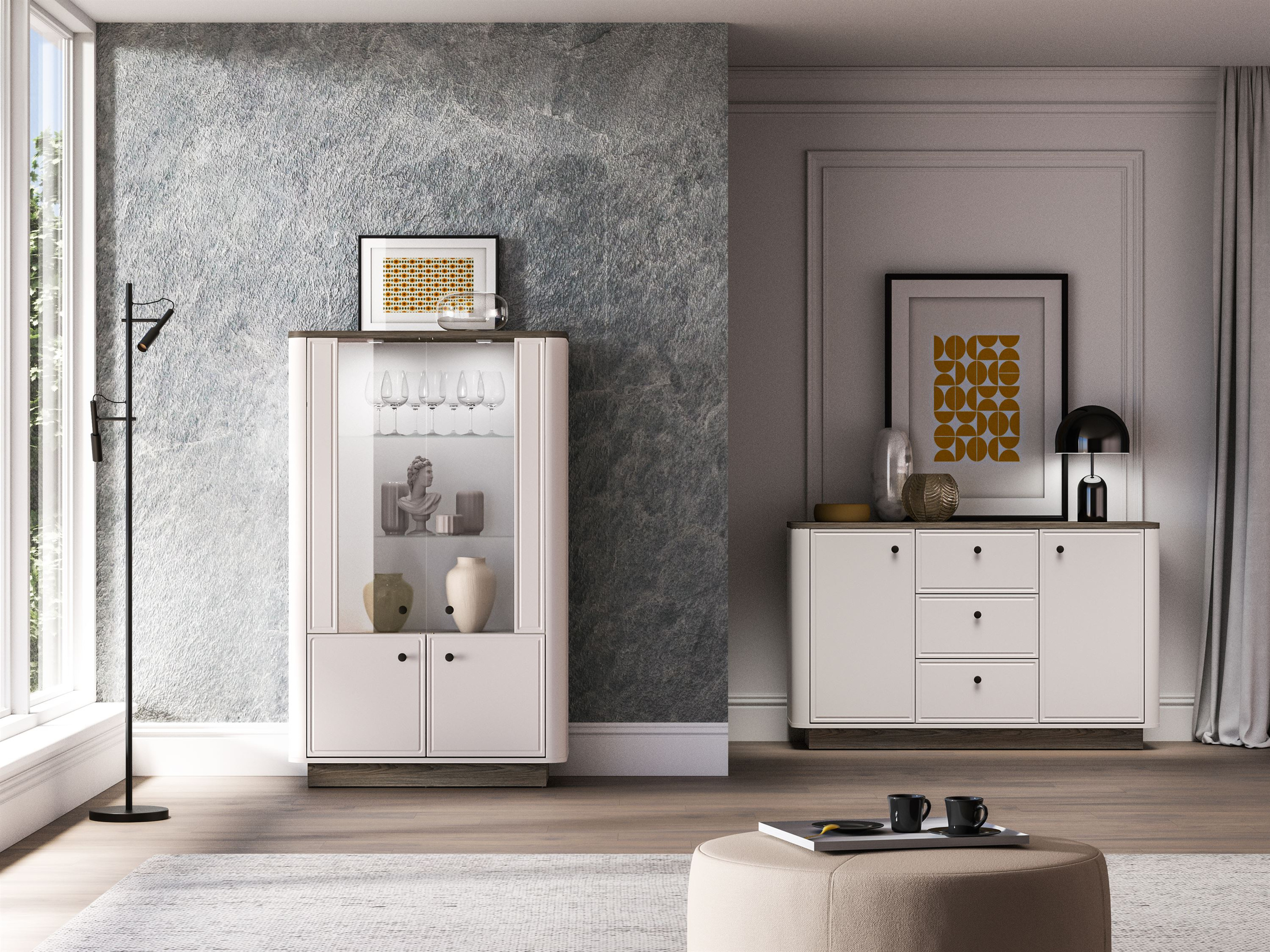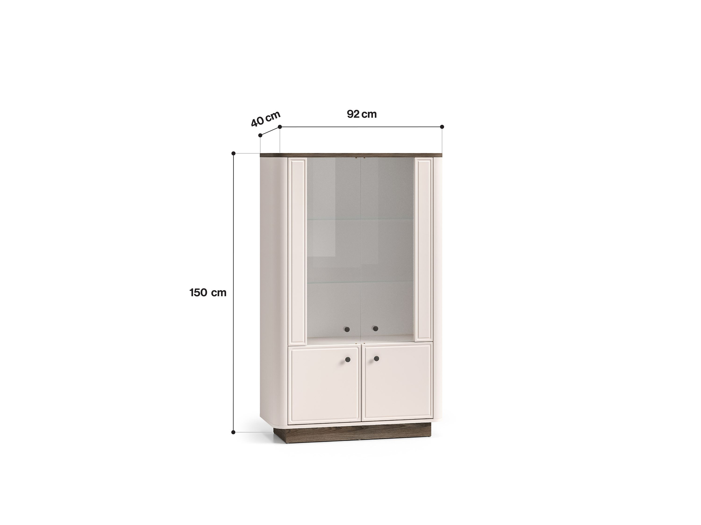 Witryna VILAVIO 02 została zaprojektowana z myślą o każdym detalu. Jej pojemne wnętrze sprawia, że doskonale nadaje się do przechowywania ulubionych książek, pamiątek czy zastawy stołowej. Cztery przestronne drzwi z subtelnym frontem w kolorze Cashmere pozwalają na estetyczne eksponowanie rzeczy, które chcesz mieć zawsze pod ręką. Dodatkowo, wbudowane zawiasy cichego domyku oraz metalowe uchwyty w czarnym macie dodają elegancji oraz komfortu użytkowania.