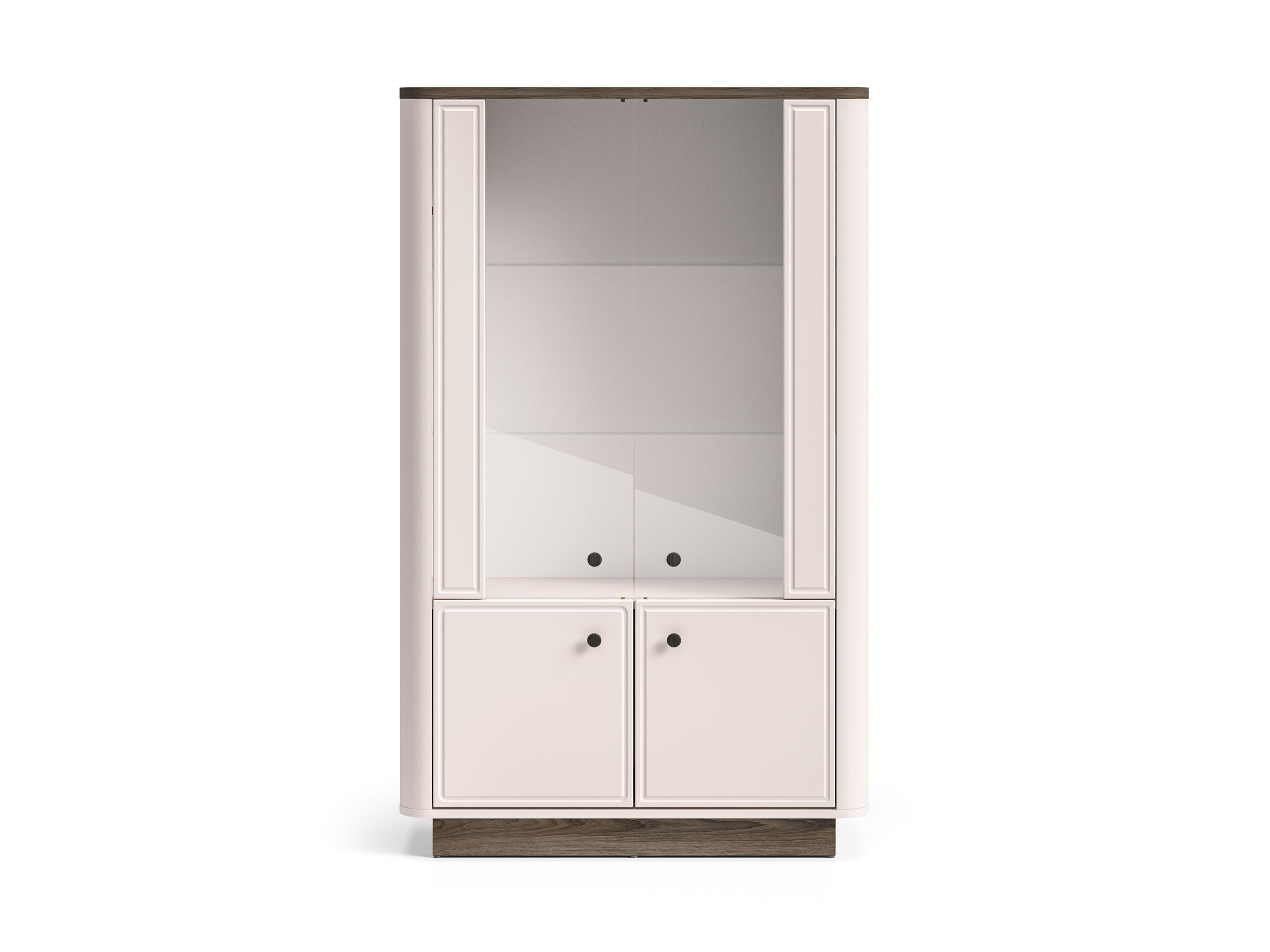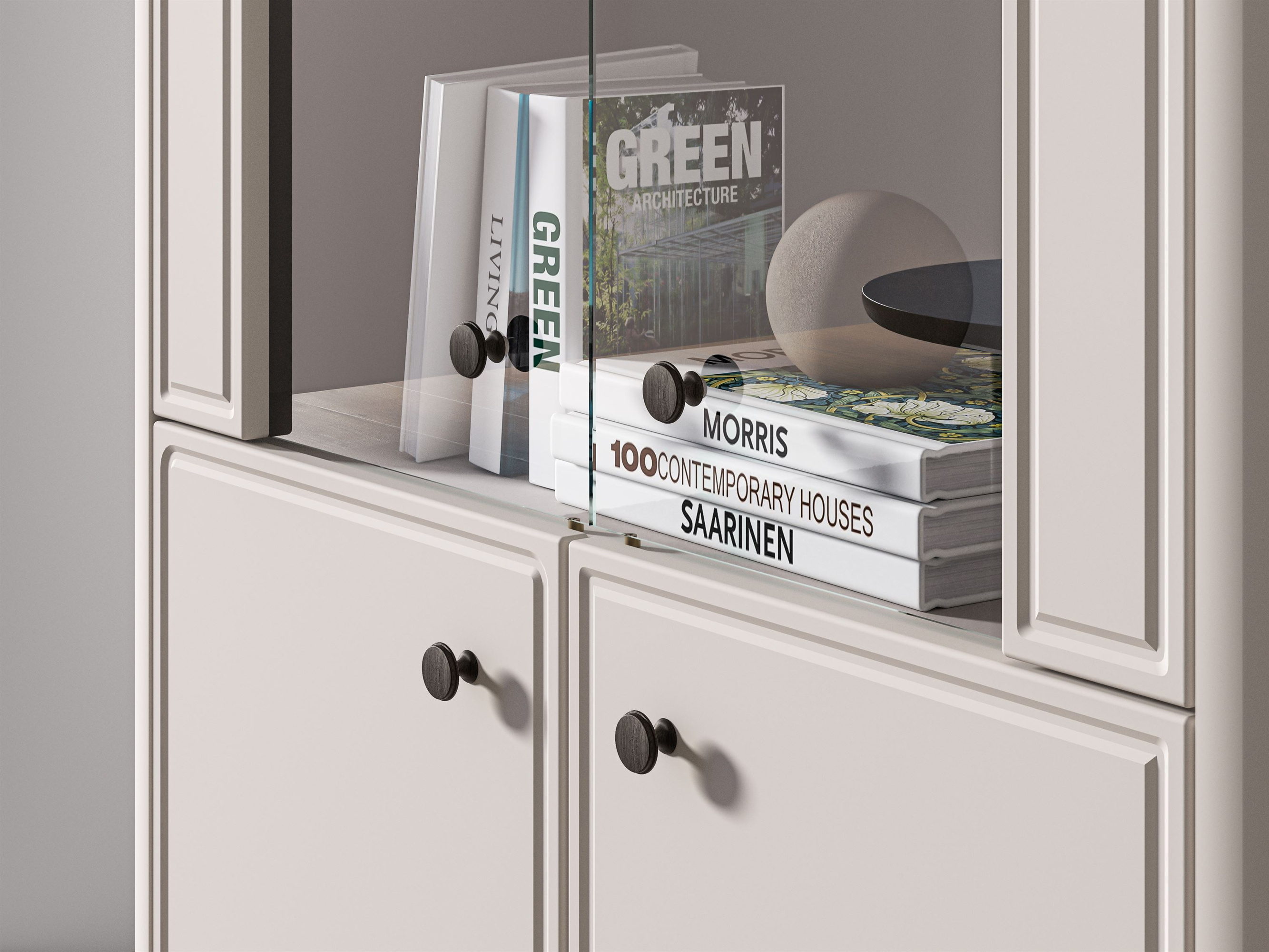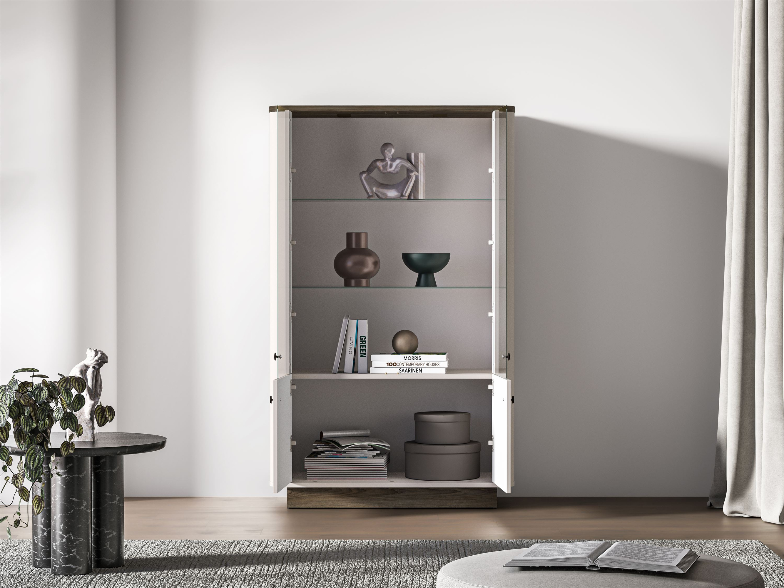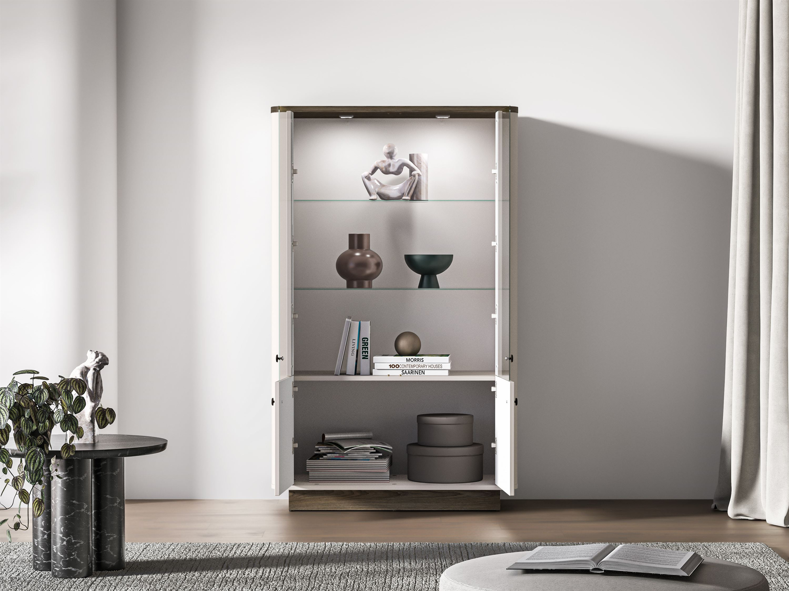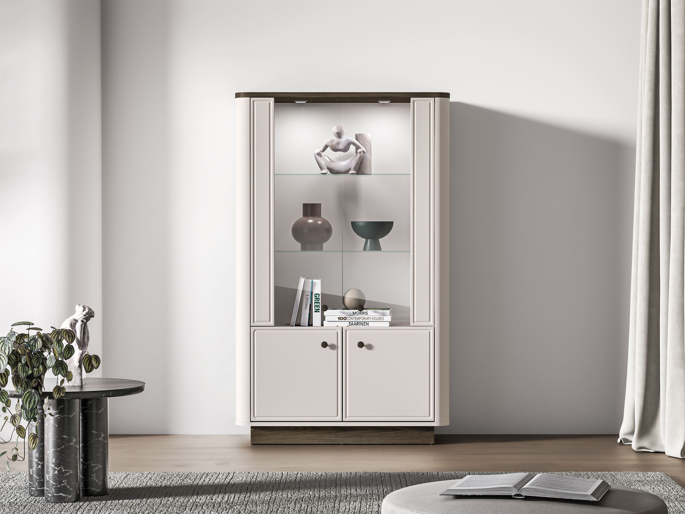 Witryna VILAVIO 02 została zaprojektowana z myślą o każdym detalu. Jej pojemne wnętrze sprawia, że doskonale nadaje się do przechowywania ulubionych książek, pamiątek czy zastawy stołowej. Cztery przestronne drzwi z subtelnym frontem w kolorze Cashmere pozwalają na estetyczne eksponowanie rzeczy, które chcesz mieć zawsze pod ręką. Dodatkowo, wbudowane zawiasy cichego domyku oraz metalowe uchwyty w czarnym macie dodają elegancji oraz komfortu użytkowania.