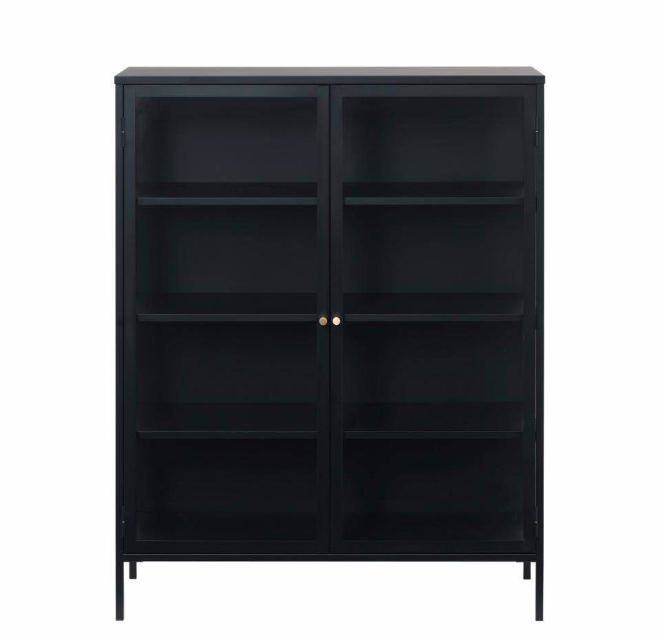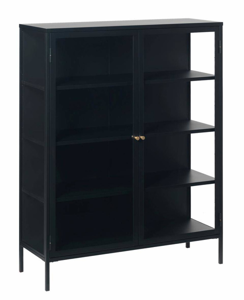 - Witryna o wysokości 140 cm z dwojgiem drzwi i jedną półką wykonana z metalu w kolorze metalicznej czerni. Styl nowoczesny, industrialny.