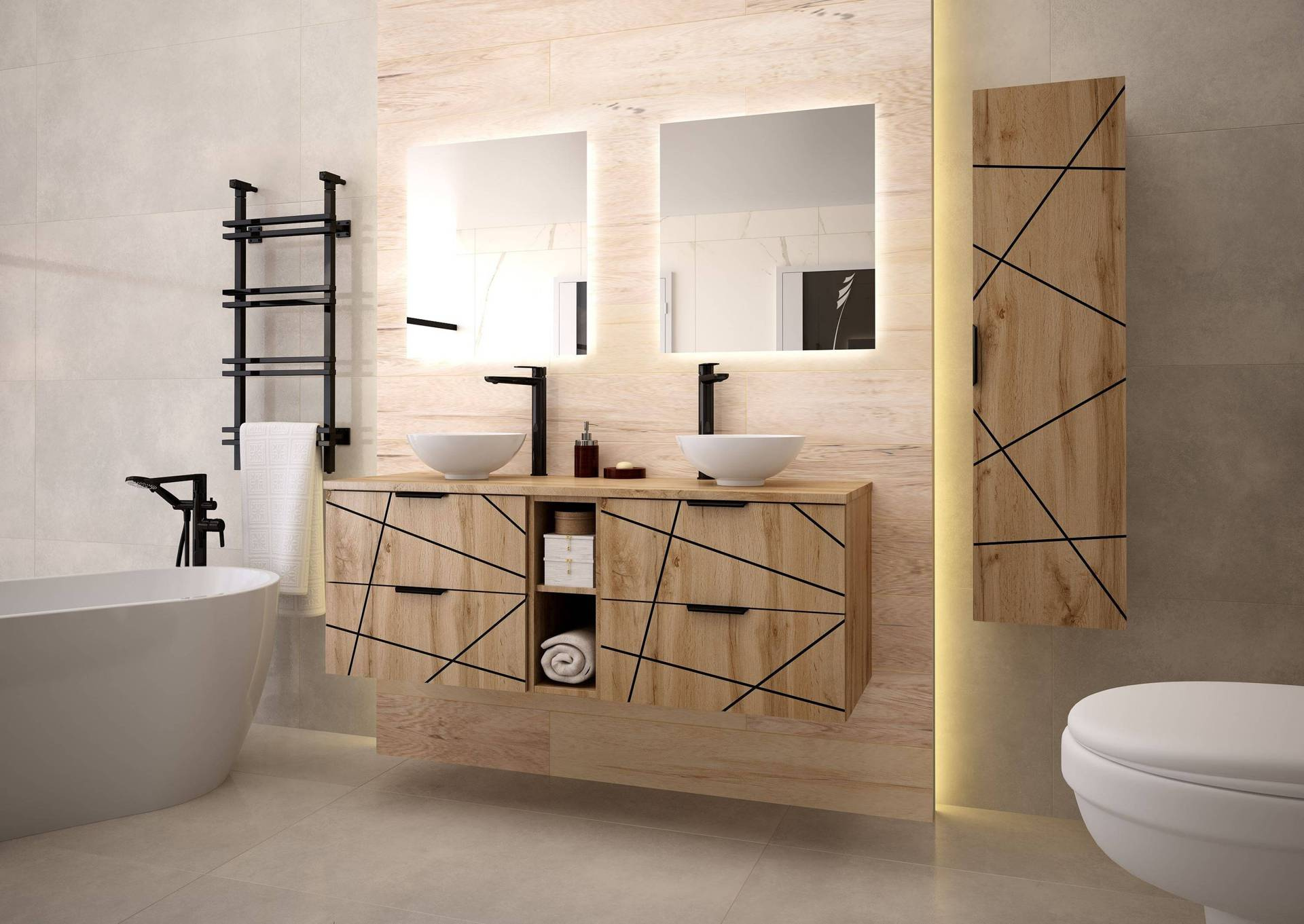 Słupek WOOD-03 to stylowe uzupełnienie wnętrza, wykonane z płyt MDF i laminowanej w kolorze dębu Wotan. Czarne, matowe uchwyty z metalu dodają elegancji. Dzięki cichym zawiasom i możliwości montażu prawego lub lewego, to funkcjonalny wybór dla każdego.
