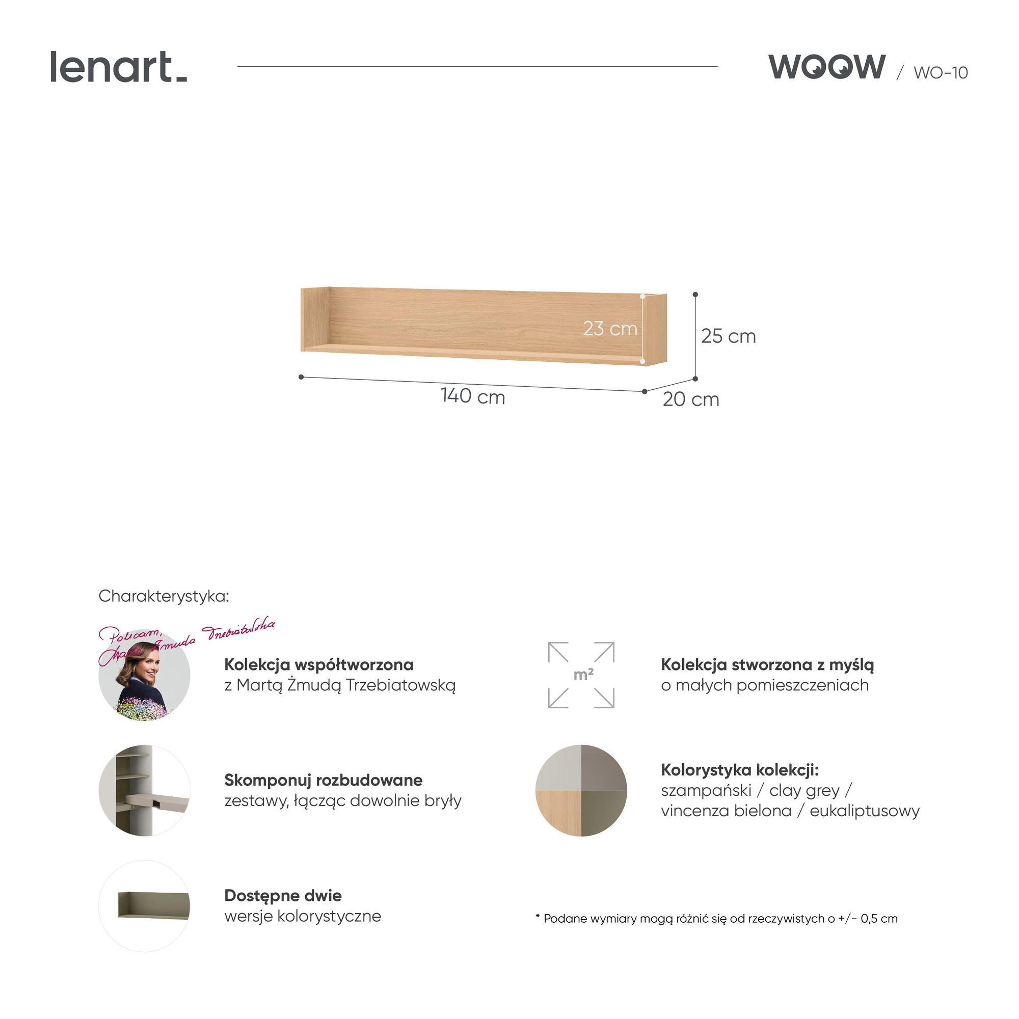 Dzięki zastosowaniu najwyższej jakości płyty laminowanej, półka WOOW WO-10 jest nie tylko estetyczna, ale także trwała i łatwa w utrzymaniu czystości. Jej powierzchnia charakteryzuje się odpornością na zarysowania i plamy, co sprawia, że zawsze będzie wyglądać jak nowa. Każdy detal został starannie przemyślany, aby zapewnić nie tylko piękny wygląd, ale także komfort codziennego użytkowania.